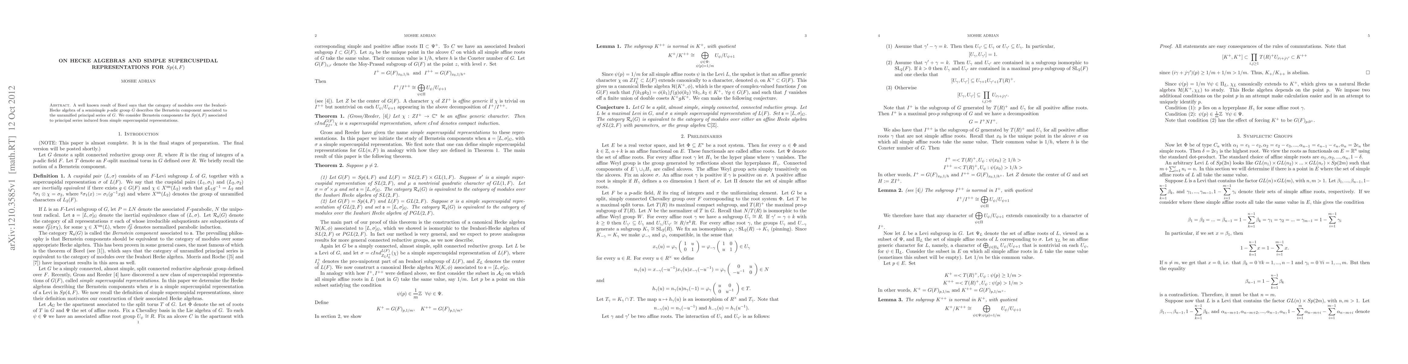 A well known result of Borel says that the category of modules over the Iwahori-Hecke algebra of a semisimple p-adic group G describes the Bernstein component associated to the unramified principal series of G. We consider Bernstein components for Sp(4,F) associated to principal series induced from simple supercuspidal representations.