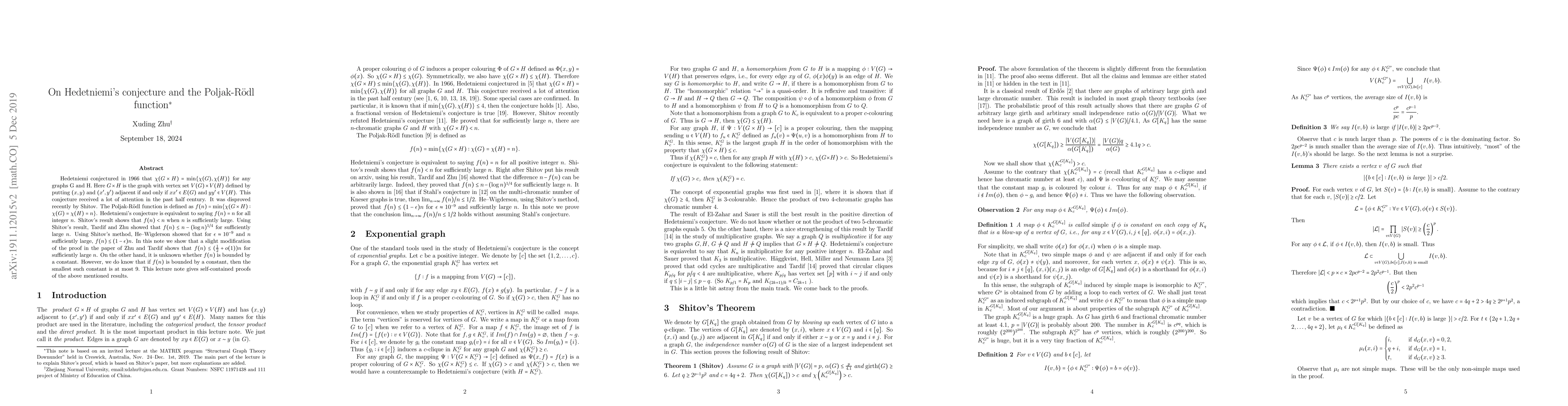 This paper discusses the disproof of Hedetniemi's conjecture, which posited that the chromatic number of the graph product of two graphs equals the minimum of their individual chromatic numbers. Shitov recently disproved this conjecture, demonstrating that the chromatic product can be smaller. Building on this, the paper presents improvements to bounds on the Poljak-Rödl function f(n), which is related to this conjecture. It's shown that f(n) ≤ (1/2 + o(1))n for large n, while the smallest constant bound, if it exists, is at most 9.