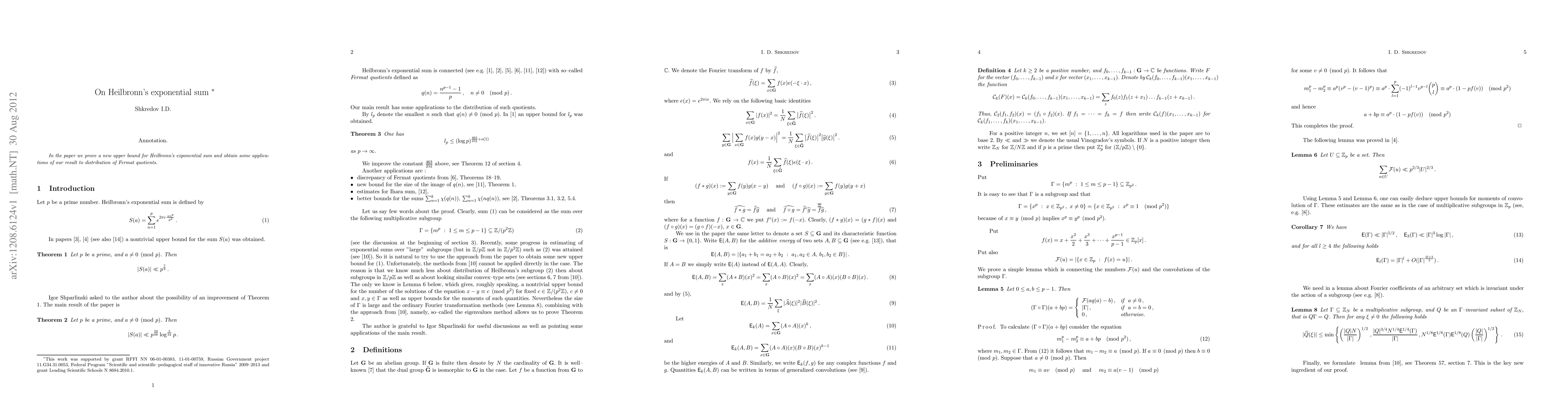 Summary: This paper establishes a novel upper bound for Heilbronn's exponential sum and demonstrates its application in understanding the distribution properties of Fermat quotients.