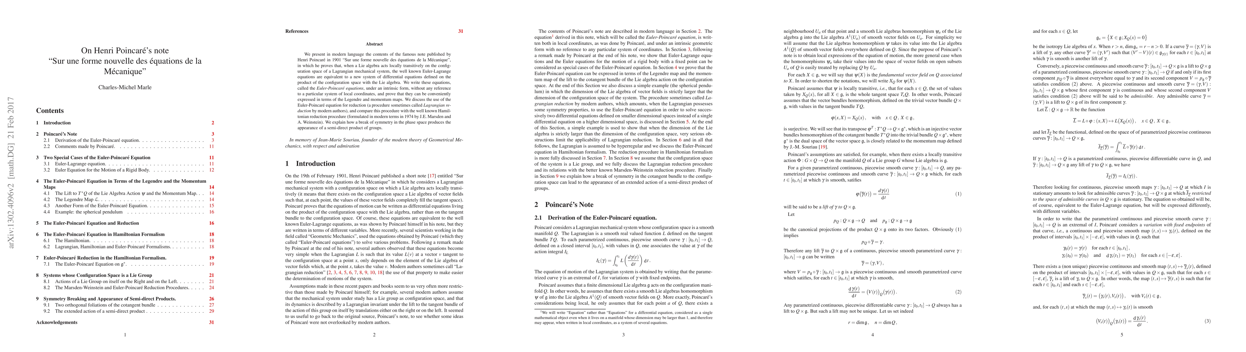 We present in modern language the contents of the famous note published by Henri Poincar\'e in 1901 "Sur une forme nouvelle des \'equations de la M\'ecanique", in which he proves that, when a Lie algebra acts locally transitively on the configuration space of a Lagrangian mechanical system, the well known Euler-Lagrange equations are equivalent to a new system of differential equations defined on the product of the configuration space with the Lie algebra. We write these equations, called the \emph{Euler-Poincar\'e equations}, under an intrinsic form, without any reference to a particular system of local coordinates, and prove that they can be conveniently expressed in terms of the Legendre and momentum maps. We discuss the use of the Euler-Poincar\'e equation for reduction (a procedure sometimes called Lagrangian reduction by modern authors), and compare this procedure with the well known Hamiltonian reduction procedure (formulated in modern terms in 1974 by J.E. Marsden and A. Weinstein). We explain how a break of symmetry in the phase space produces the appearance of a semi-direct product of groups.