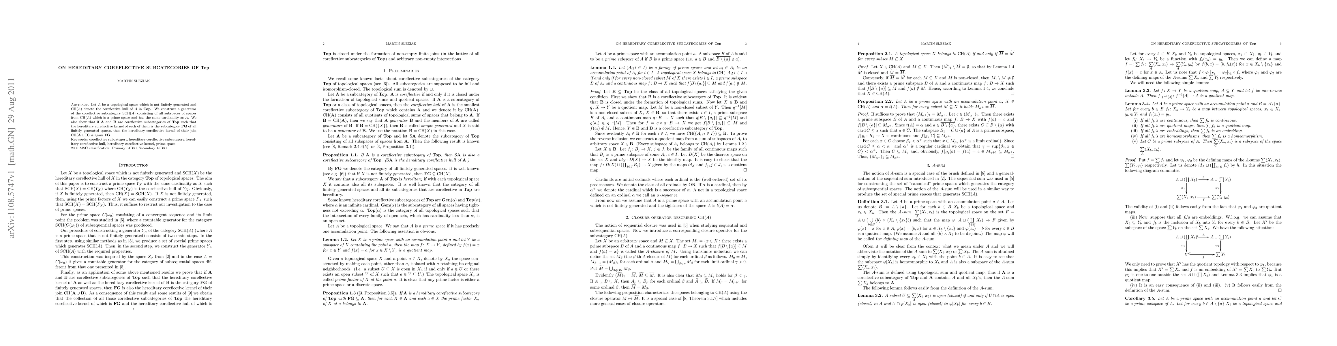 This paper constructs a generator for the coreflective subcategory SCH(A) of Top, where A is a non-finitely generated topological space, and proves that the hereditary coreflective kernel of the join of coreflective subcategories remains the subcategory of finitely generated spaces.