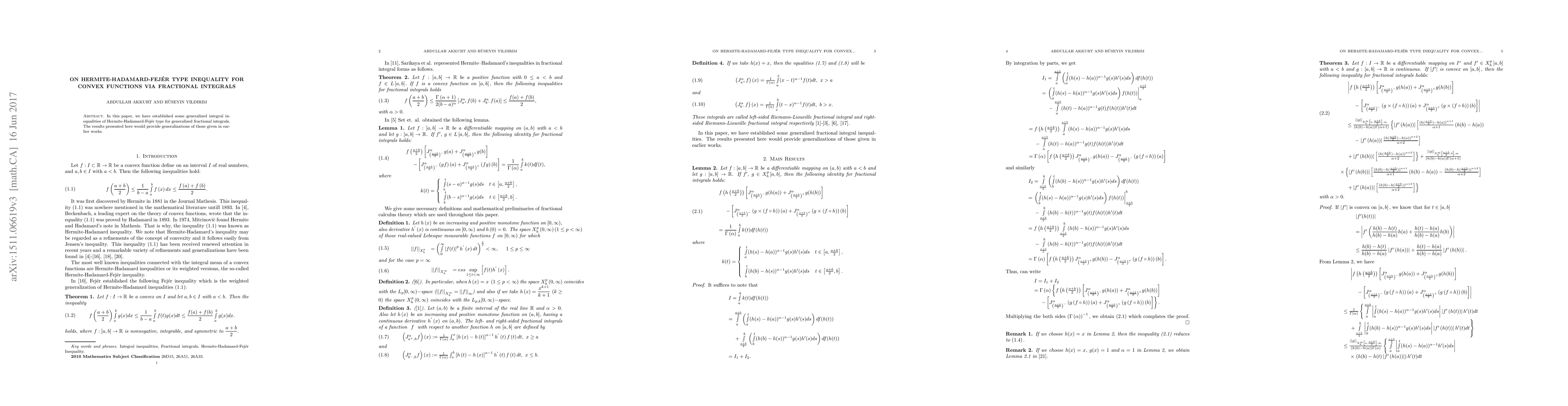 Summary: This paper establishes generalized Hermite-Hadamard-Fejér type integral inequalities for convex functions using fractional integrals, offering extensions beyond previous works. The results provide new insights into the behavior of convex functions through fractional integral frameworks.