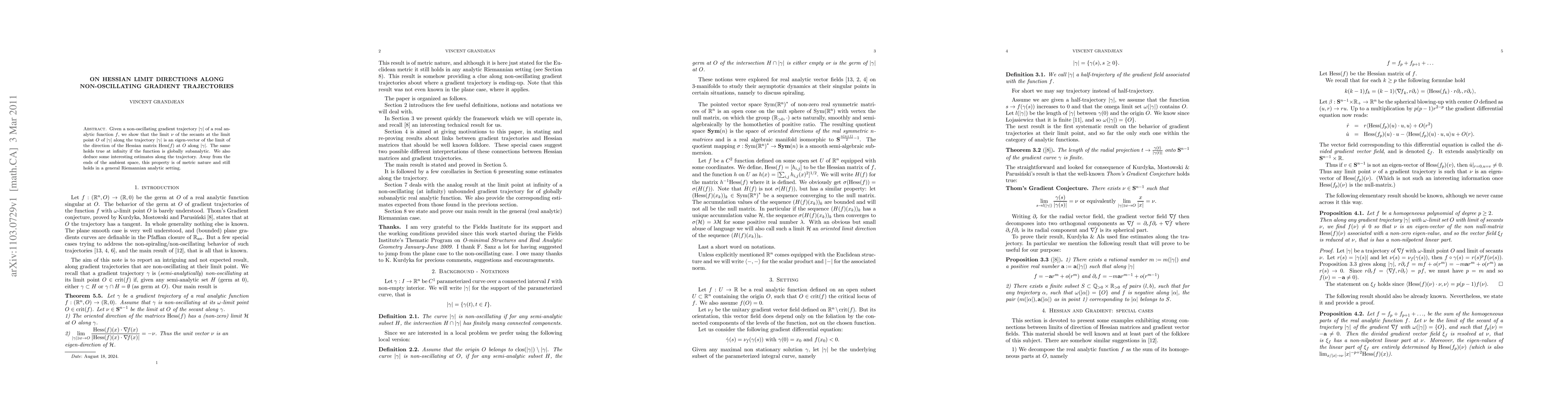 Given a non-oscillating gradient trajectory G of a real analytic function f, we show that the limit v of the secants at the limit point O of G along the trajectory G is an eigen-vector of the limit of the direction of the Hessian matrix Hess (f) at O along G. The same holds true at infinity if the function is globally subanalytic. We also deduce some interesting estimates along the trajectory.