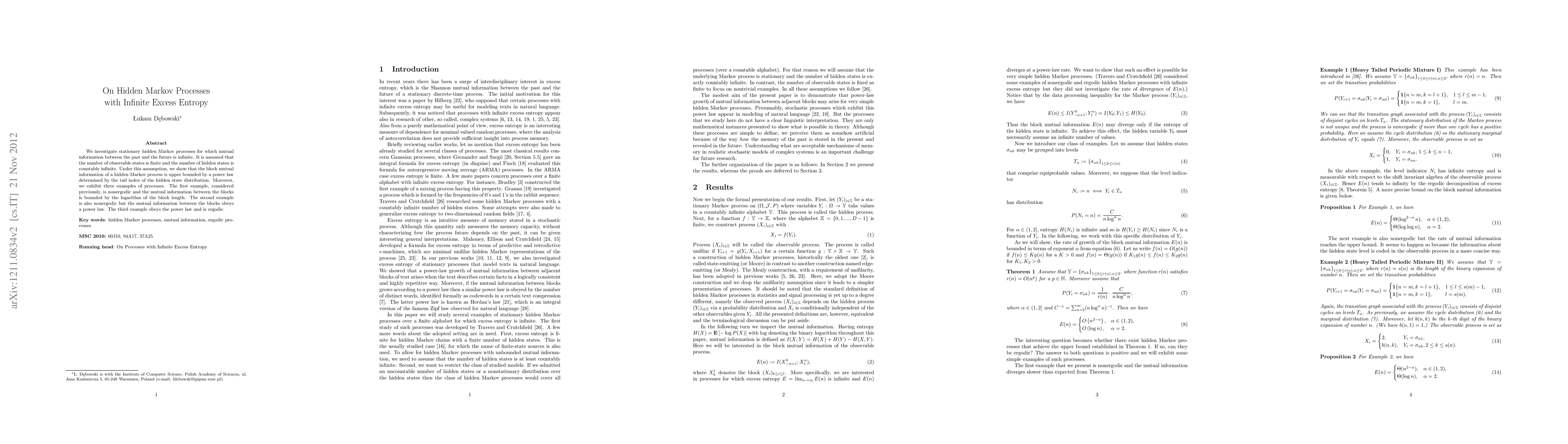 This paper explores stationary hidden Markov processes with infinite mutual information between past and future, featuring finite observable states and countably infinite hidden states. It demonstrates that block mutual information is upper bounded by a power law linked to the tail index of the hidden state distribution, and provides three examples illustrating different behaviors.