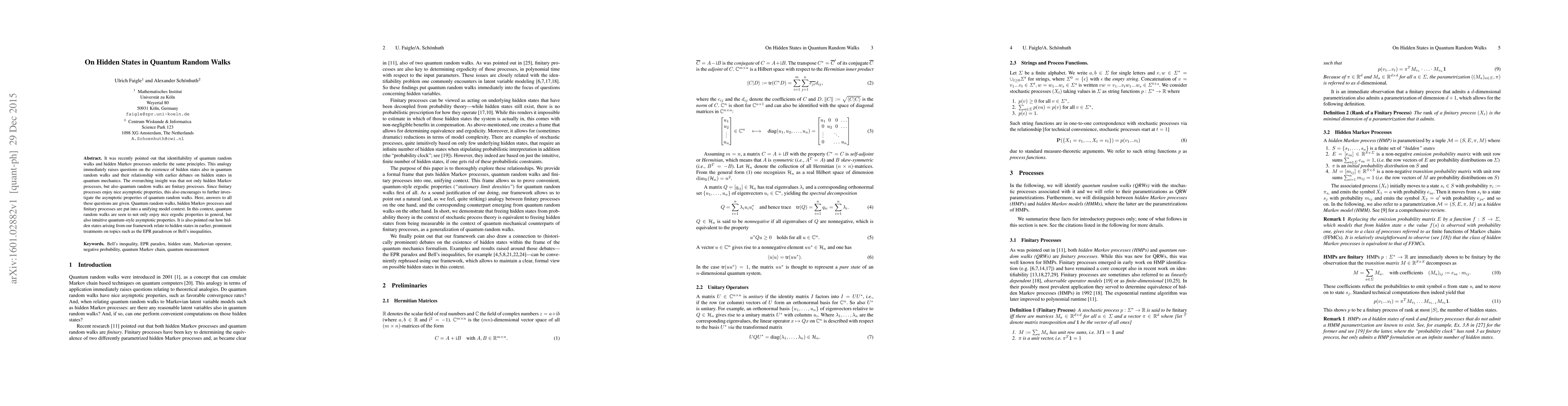 This paper explores the analogy between quantum random walks and hidden Markov processes, revealing that both are finitary processes with desirable asymptotic properties. It provides a unifying model that shows quantum random walks exhibit not only ergodic properties but also intuitive quantum-style asymptotic behaviors, linking hidden states in this framework to those in quantum mechanics debates like the EPR paradox and Bell's inequalities.