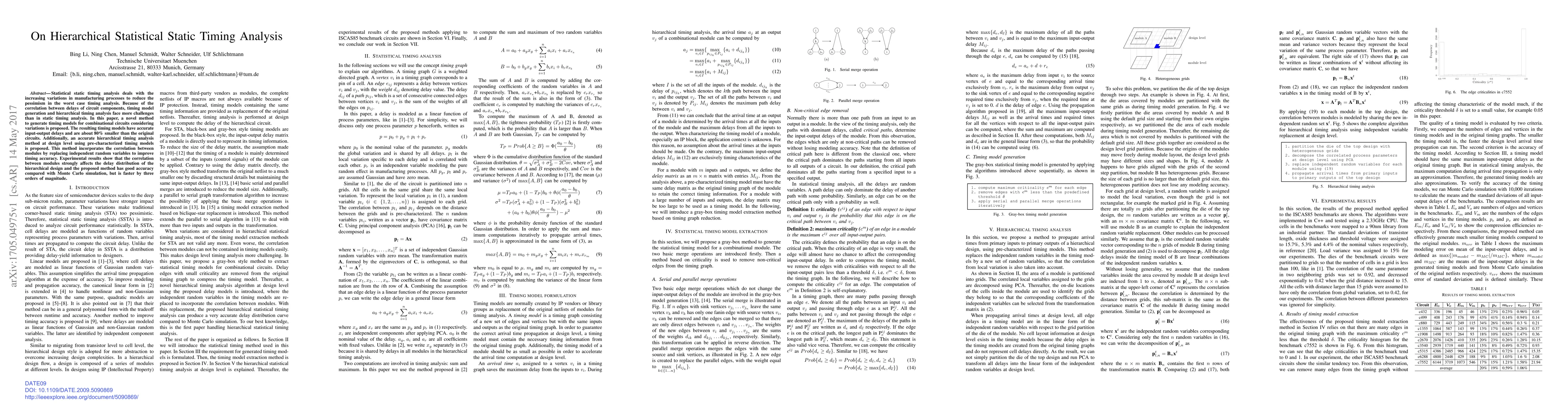 This paper proposes a novel method for generating compact timing models for combinational circuits that consider manufacturing variations, and an efficient hierarchical timing analysis method that leverages these models to improve accuracy while reducing computational time by three orders of magnitude compared to Monte Carlo simulation.