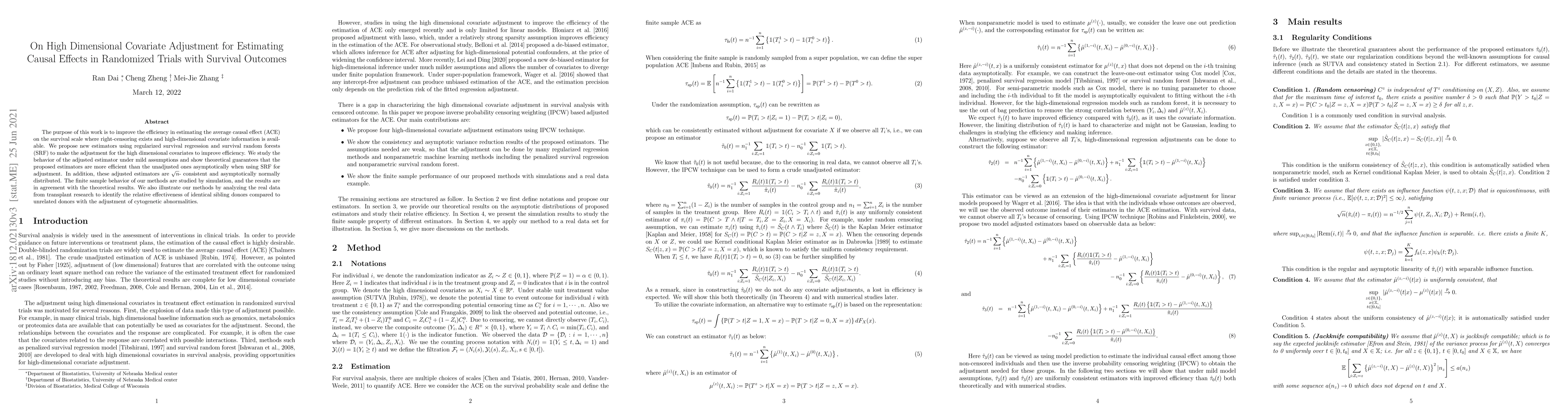 This paper proposes new estimators for estimating causal effects in randomized trials with survival outcomes, incorporating high-dimensional covariate adjustment using regularized survival regression and survival random forests. The adjusted estimators are shown to be more efficient and theoretically consistent and normally distributed, validated through simulations and real data analysis in transplant research.