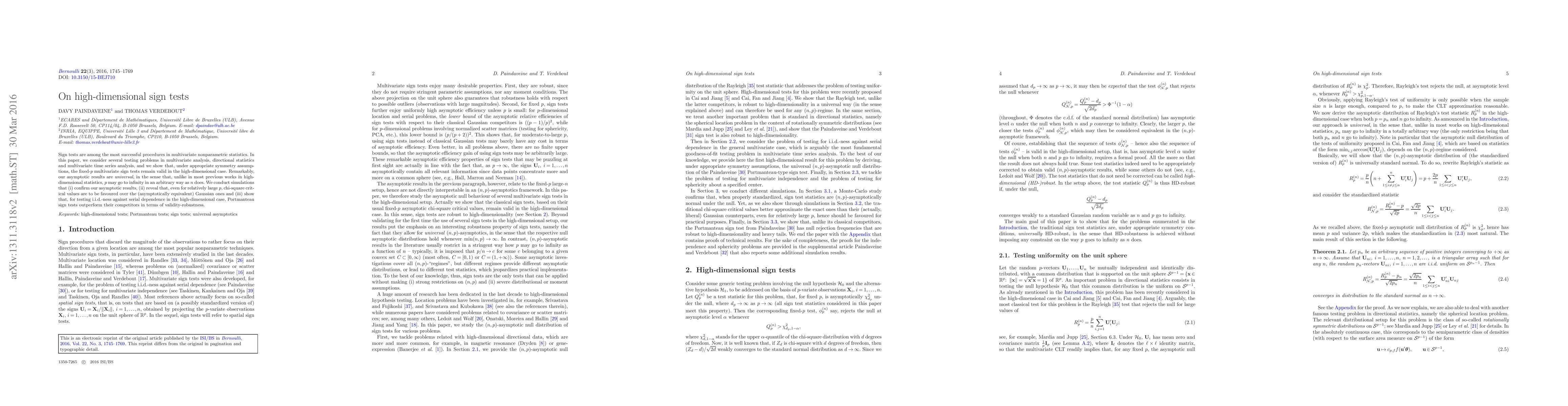 High-dimensional sign tests maintain validity under symmetry assumptions, even as the number of variables increases infinitely, and outperform competitors in testing for independence and serial dependence.