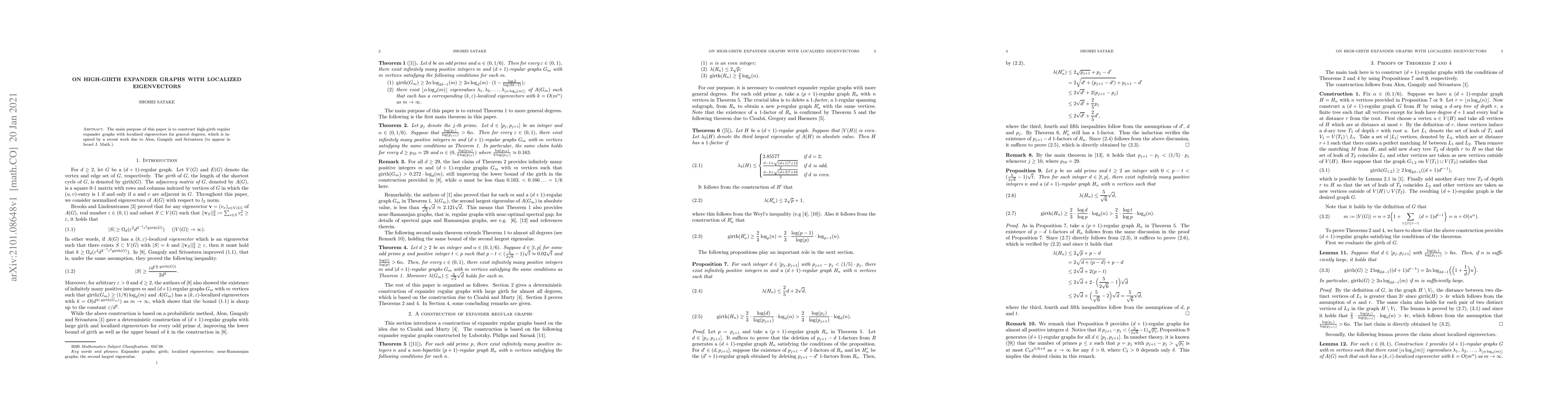 This paper constructs high-girth regular expander graphs for any given degree, focusing on achieving localized eigenvectors, inspired by recent work by Alon, Ganguly, and Srivastava. The construction aims to enhance the graph's expansion properties while maintaining eigenvector localization.