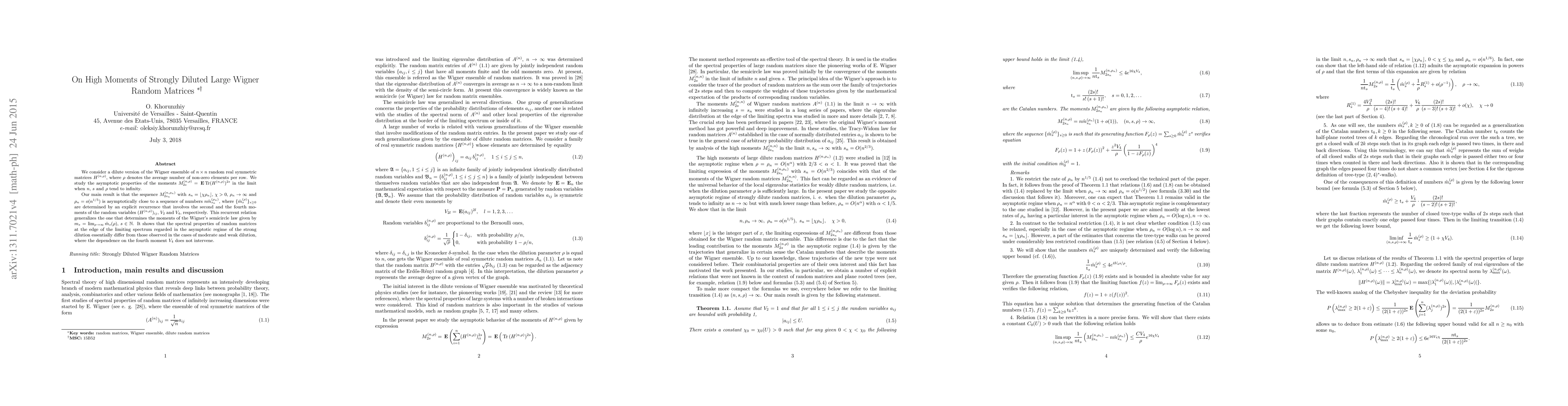 This paper investigates the high moments of strongly diluted large Wigner random matrices, demonstrating that in the regime of strong dilution, these moments depend only on the second and fourth moments of the matrix entries, indicating a unique universal behavior of the local eigenvalue distribution. Additionally, it introduces a new class of Catalan-type numbers linked to tree-type walks.