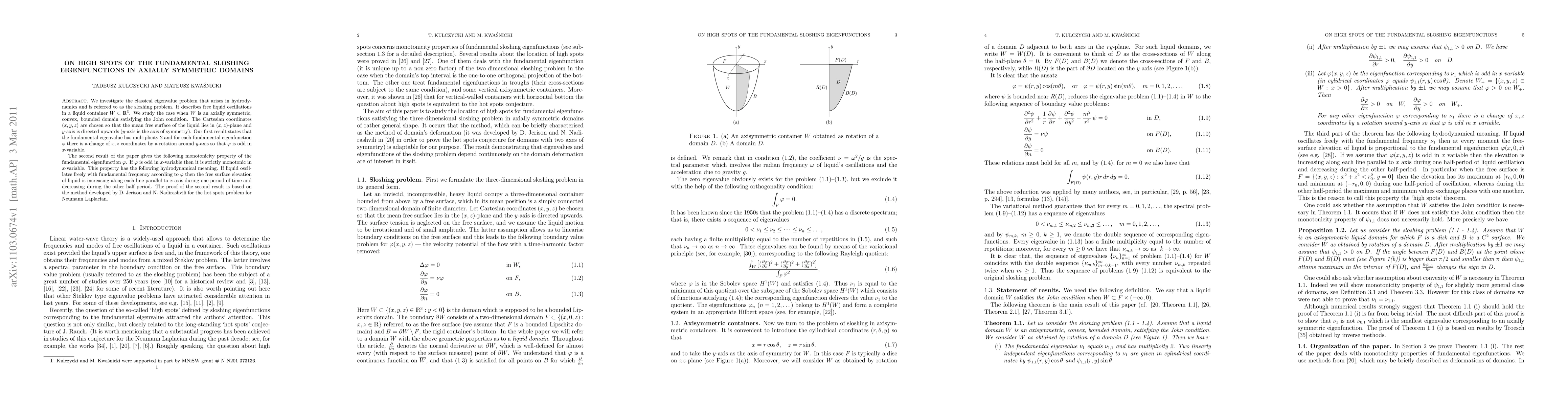 We investigate the classical eigenvalue problem that arises in hydrodynamics and is referred to as the sloshing problem. It describes free liquid oscillations in a liquid container W in R^3. We study the case when W is an axially symmetric, convex, bounded domain satisfying the John condition. The Cartesian coordinates (x,y,z) are chosen so that the mean free surface of the liquid lies in (x,z)-plane and y-axis is directed upwards (y-axis is the axis of symmetry). Our first result states that the fundamental eigenvalue has multiplicity 2 and for each fundamental eigenfunction phi there is a change of x,z coordinates by a rotation around y-axis so that phi is odd in x-variable. The second result of the paper gives the following monotonicity property of the fundamental eigenfunction phi. If phi is odd in x-variable then it is strictly monotonic in x-variable. This property has the following hydrodynamical meaning. If liquid oscillates freely with fundamental frequency according to phi then the free surface elevation of liquid is increasing along each line parallel to x-axis during one period of time and decreasing during the other half period. The proof of the second result is based on the method developed by D. Jerison and N. Nadirashvili for the hot spots problem for Neumann Laplacian.