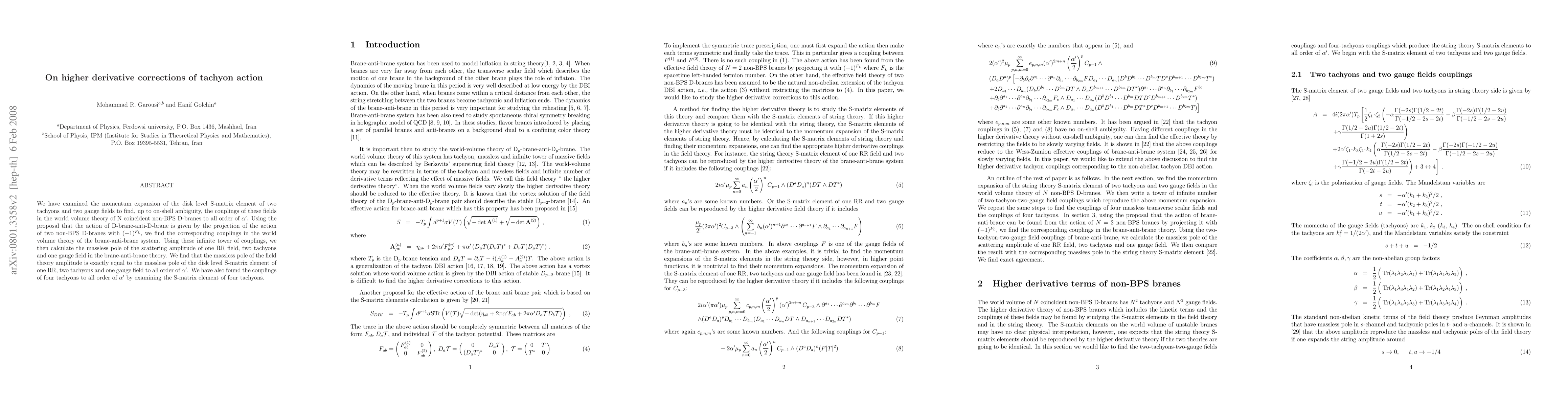 We have examined the momentum expansion of the disk level S-matrix element of two tachyons and two gauge fields to find, up to on-shell ambiguity, the couplings of these fields in the world volume theory of N coincident non-BPS D-branes to all order of $\alpha'$. Using the proposal that the action of D-brane-anti-D-brane is given by the projection of the action of two non-BPS D-branes with $(-1)^{F_L}$, we find the corresponding couplings in the world volume theory of the brane-anti-brane system. Using these infinite tower of couplings, we then calculate the massless pole of the scattering amplitude of one RR field, two tachyons and one gauge field in the brane-anti-brane theory. We find that the massless pole of the field theory amplitude is exactly equal to the massless pole of the disk level S-matrix element of one RR, two tachyons and one gauge field to all order of $\alpha'$.