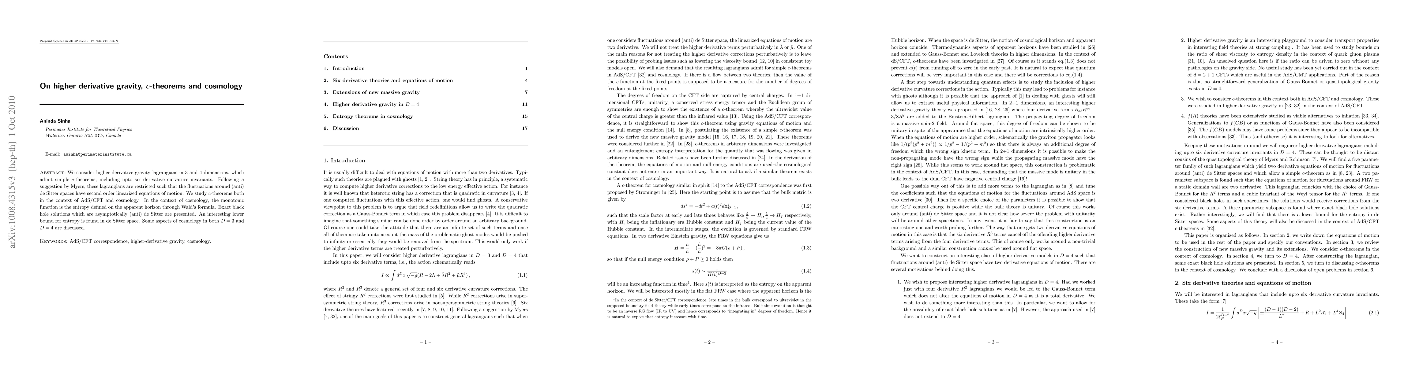 This paper examines higher derivative gravity theories in 3 and 4 dimensions, focusing on c-theorems and their implications for cosmology. It explores restricted Lagrangians with up to six derivative curvature invariants, ensuring second-order linearized equations around (anti)de Sitter spaces and discusses the entropy monotonicity in cosmological contexts.
