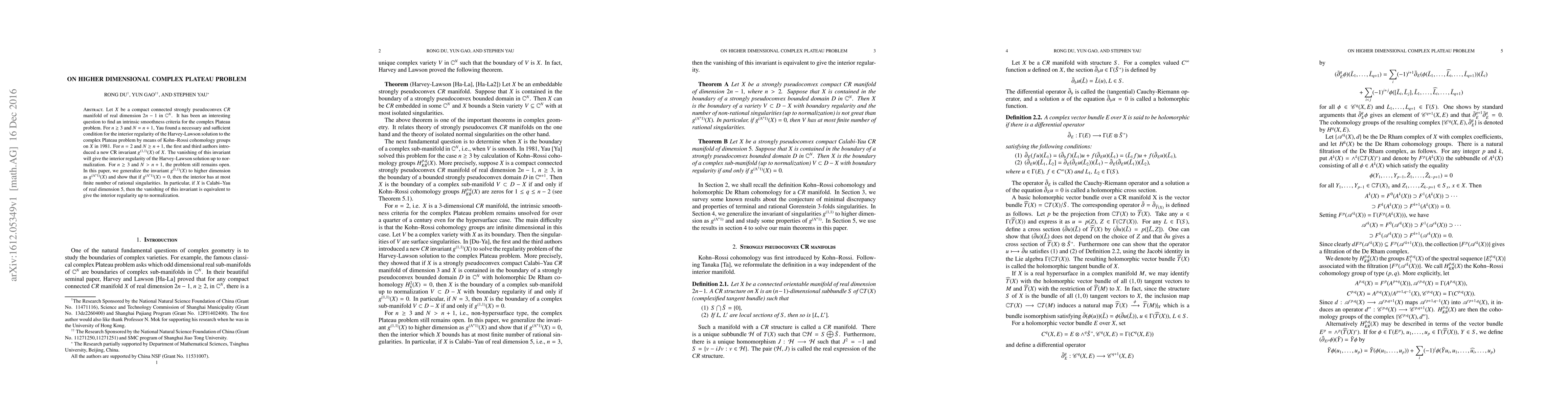 This paper explores the higher-dimensional complex Plateau problem by generalizing a CR invariant $g^{(1,1)}(X)$ to $g^{(\Lambda^n 1)}(X)$ for $n\ge 3$. It demonstrates that the vanishing of this invariant implies the interior has at most finite rational singularities, particularly proving interior regularity up to normalization for Calabi-Yau manifolds of real dimension 5.