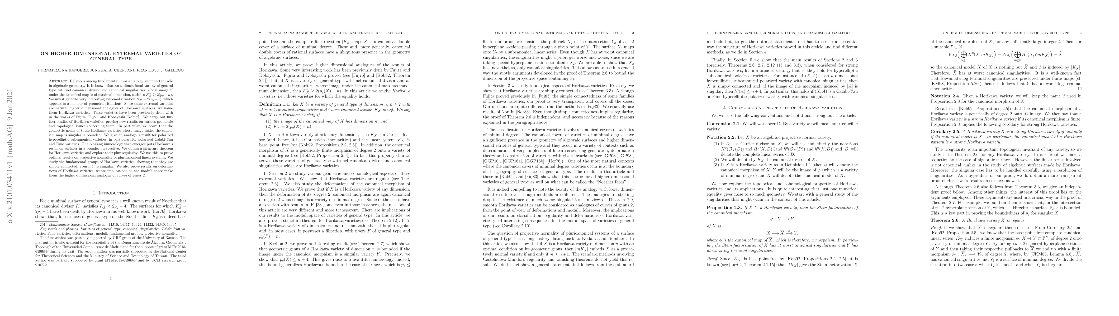 Relations among fundamental invariants play an important role in algebraic geometry. It is known that an $n$-dimensional variety of general type with nef canonical divisor and canonical singularities, whose image $Y$ under the canonical map is of maximal dimension, satisfies $K_X^n \ge 2 (p_g-n)$. We investigate the very interesting extremal situation $K_X^n=2(p_g-n)$, which appears in a number of geometric situations. Since these extremal varieties are natural higher dimensional analogues of Horikawa surfaces, we name them Horikawa varieties. These varieties have been previously dealt with inthe works of Fujita and Kobayashi. We carry out further studies of Horikawa varieties, proving new results on various geometric and topological issues concerning them. In particular, we prove that the geometric genus of those Horikawa varieties whose image under the canonical map is singular is bounded. We give an analogous result for polarized hyperelliptic subcanonical varieties, in particular, for polarized Calabi-Yau and Fano varieties. The pleasing numerology that emerges puts Horikawa's result on surfaces in a broader perspective. We obtain a structure theorem for Horikawa varieties and explore their pluriregularity. We use this to prove optimal results on projective normality of pluricanonical linear systems. We study the fundamental groups of Horikawa varieties, showing that they are simply connected, even if $Y$ is singular. We also prove results on deformations of Horikawa varieties, whose implications on the moduli space make them the higher dimensional analogue of curves of genus $2$.