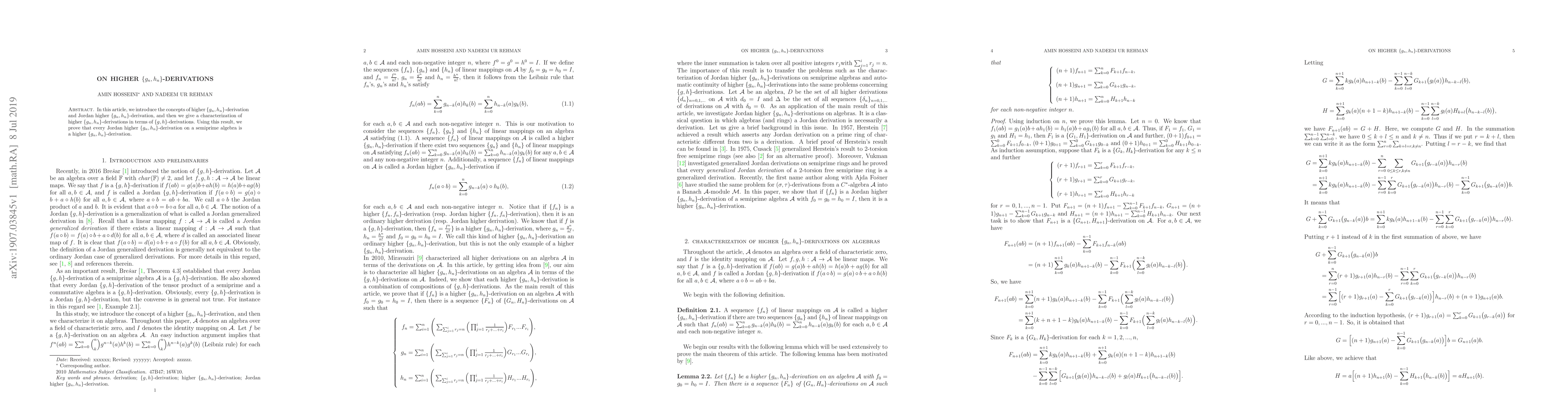 This paper introduces higher {g_n, h_n}-derivations and Jordan higher {g_n, h_n}-derivations, and characterizes higher {g_n, h_n}-derivations in terms of {g, h}-derivations, ultimately proving that every Jordan higher {g_n, h_n}-derivation on a semiprime algebra is a higher {g_n, h_n}-derivation.
