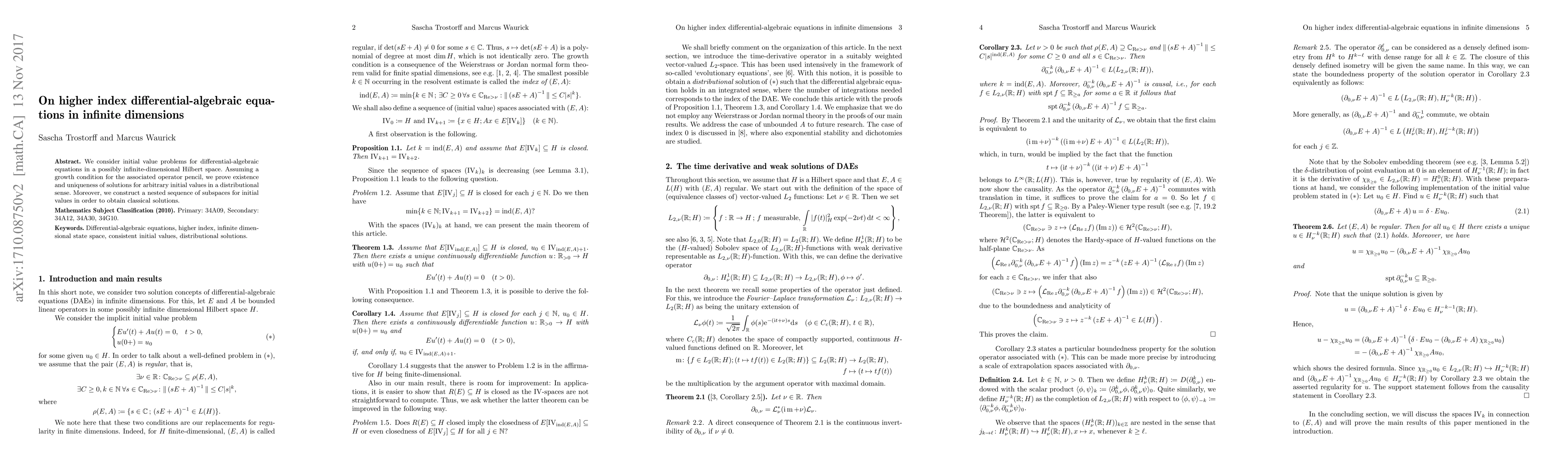 This paper explores initial value problems for differential-algebraic equations in infinite-dimensional Hilbert spaces, proving existence and uniqueness of solutions under a growth condition. It also constructs subspaces for initial values to derive classical solutions.