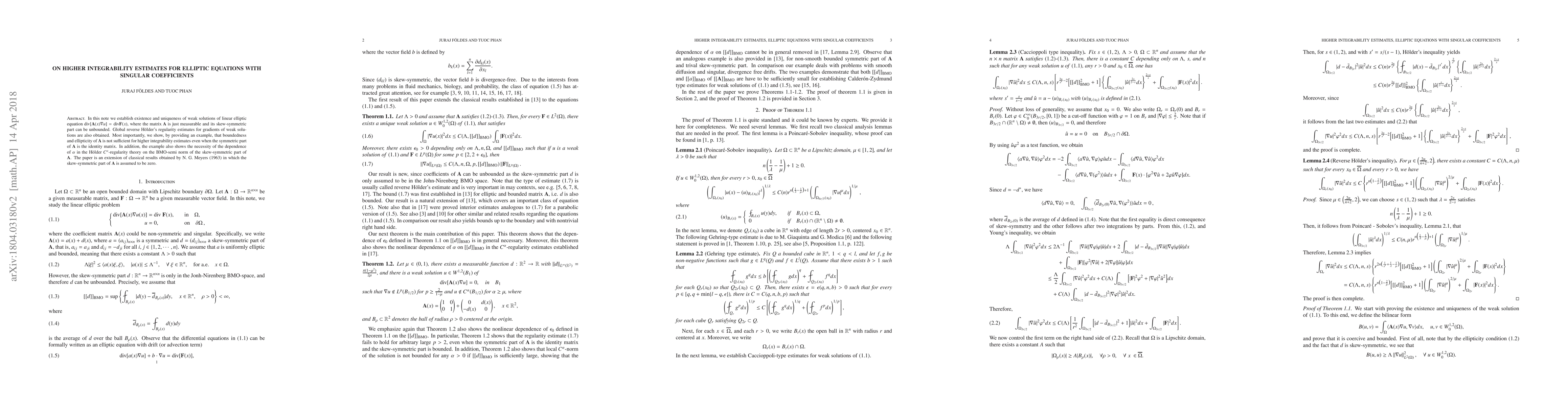 This paper establishes existence and uniqueness of weak solutions for linear elliptic equations with singular coefficients, showing that boundedness and ellipticity are not sufficient for higher integrability estimates, and highlighting the importance of the skew-symmetric part of the coefficient matrix.