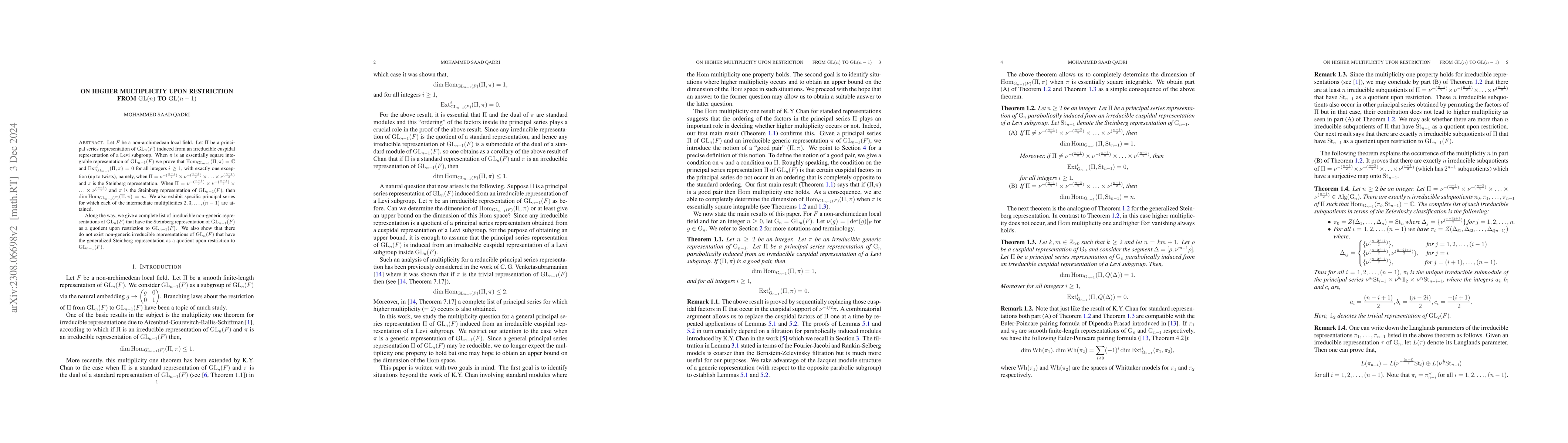 This paper investigates the higher multiplicity phenomenon in the restriction of representations from $\rm{GL}_n(F)$ to $\rm{GL}_{n-1}(F)$, proving that $\rm{Hom}_{\rm{GL}_{n-1}}(\Pi,\pi) = \mathbb{C}$ and $\rm{Ext}^i_{\rm{GL}_{n-1}}(\Pi,\pi) = 0$ for all $i\geq 1$ except when $\Pi$ and $\pi$ are specific Steinberg representations, in which case $\dim \rm{Hom}_{\rm{GL}_{n-1}}(F)}(\Pi,\pi)=n$.