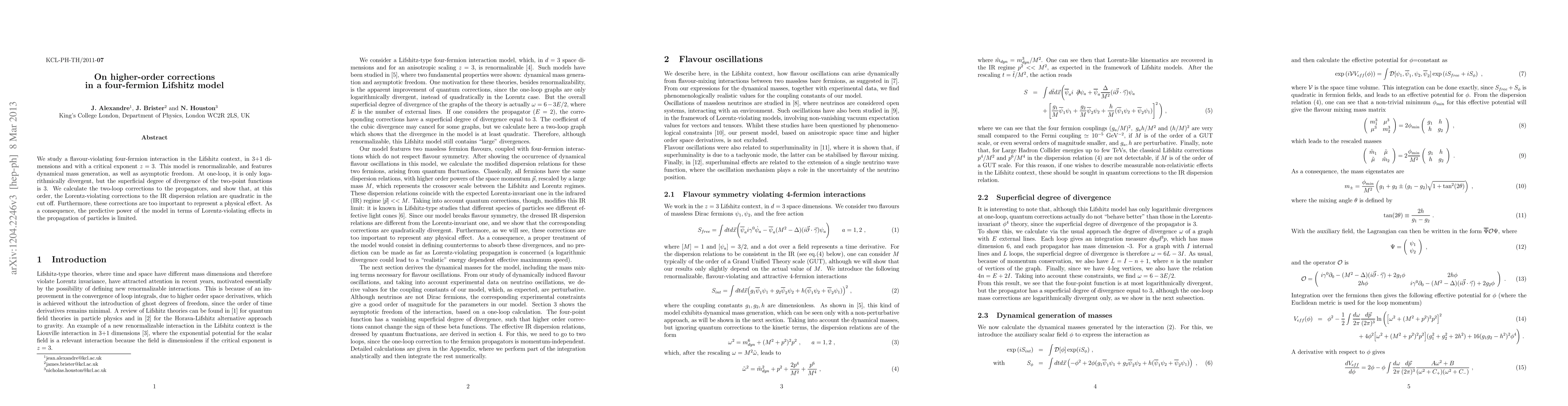 We study a flavour-violating four-fermion interaction in the Lifshitz context, in 3+1 dimensions and with a critical exponent z=3. This model is renormalizable, and features dynamical mass generation, as well as asymptotic freedom. At one-loop, it is only logarithmically divergent, but the superficial degree of divergence of the two-point functions is 3. We calculate the two-loop corrections to the propagators, and show that, at this order, the Lorentz-violating corrections to the IR dispersion relation are quadratic in the cut off. Furthermore, these corrections are too important to represent a physical effect. As a consequence, the predictive power of the model in terms of Lorentz-violating effects in the propagation of particles is limited.