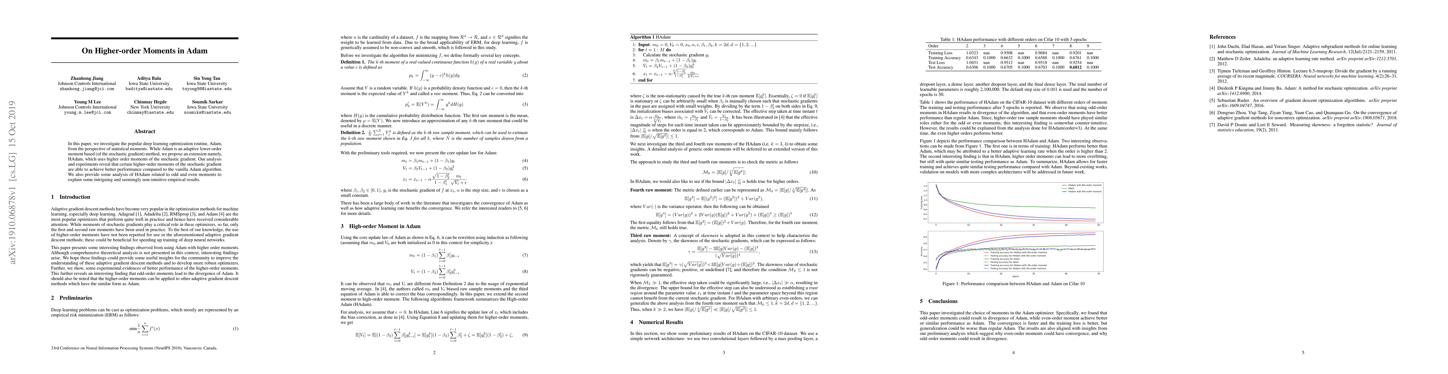 In this paper, we investigate the popular deep learning optimization routine, Adam, from the perspective of statistical moments. While Adam is an adaptive lower-order moment based (of the stochastic gradient) method, we propose an extension namely, HAdam, which uses higher order moments of the stochastic gradient. Our analysis and experiments reveal that certain higher-order moments of the stochastic gradient are able to achieve better performance compared to the vanilla Adam algorithm. We also provide some analysis of HAdam related to odd and even moments to explain some intriguing and seemingly non-intuitive empirical results.