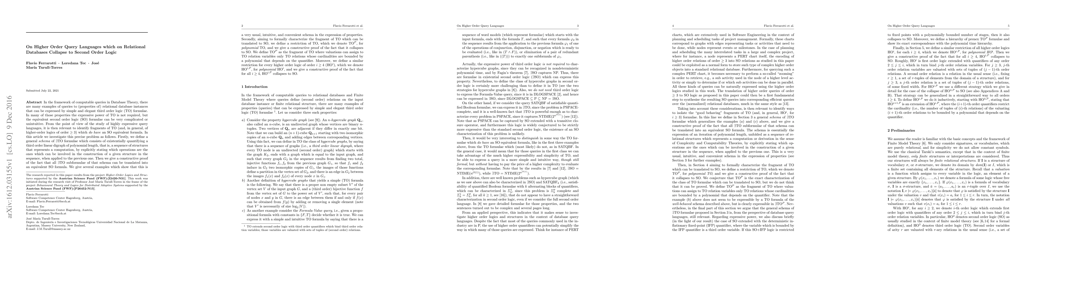 In the framework of computable queries in Database Theory, there are many examples of queries to (properties of) relational database instances that can be expressed by simple and elegant third order logic ($\mathrm{TO}$) formulae. In many of those properties the expressive power of $\mathrm{TO}$ is not required, but the equivalent second order logic ($\mathrm{SO}$) formulae can be very complicated or unintuitive. From the point of view of the study of highly expressive query languages, it is then relevant to identify fragments of $\mathrm{TO}$ (and, in general, of higher-order logics of order $\geq 3$) which do have an $\mathrm{SO}$ equivalent formula. In this article we investigate this precise problem as follows. Firstly, we define a general schema of $\exists$TO formulas which consists of existentially quantifying a third-order linear digraph of polynomial length, that is, a sequence of structures that represents a computation, by explicitly stating which operations are the ones which can be involved in the construction of a given structure in the sequence, when applied to the previous one. Then we give a constructive proof of the fact that all $\exists$TO sub formulas of that schema can be translated into an equivalent SO formula. Secondly, aiming to formally characterize the fragment of TO which can be translated to SO, we define a restriction of TO, which we denote TO$^{P}$, for polynomial TO, and we give a constructive proof on the fact that it collapses to SO. We define TO$^{P}$ as the fragment of TO where valuations can assign to TO relation variables only TO relations whose cardinalities are bounded by a polynomial that depends on the quantifier. Moreover, we define a similar restriction for every higher order logic of order $i \geq 4$, which we denote $\mathrm{HO}^{i,P}$, and give a constructive proof of the fact that for all $i \geq 4$, $\mathrm{HO}^{i,P}$ collapses to SO.