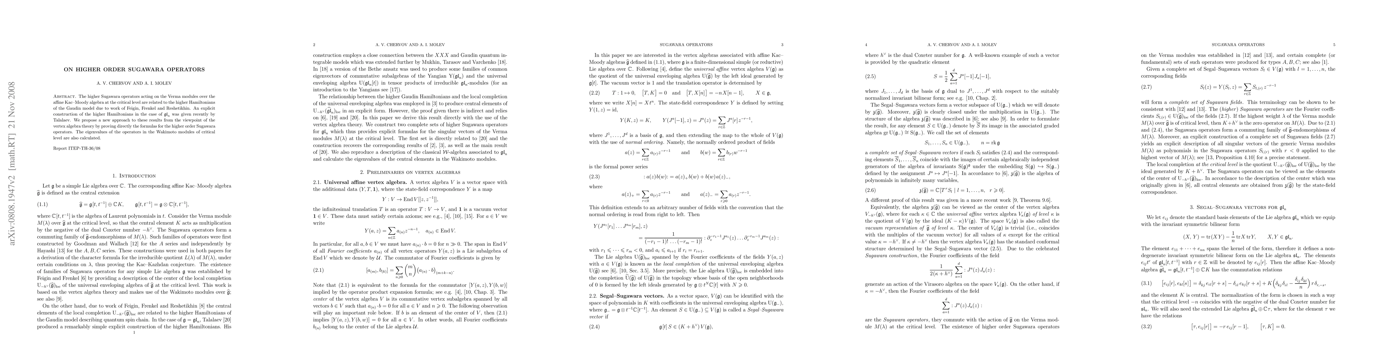 This paper proposes a new approach to higher order Sugawara operators using vertex algebra theory, directly proving their formulas and relating them to the higher Hamiltonians of the Gaudin model. It also calculates the eigenvalues of these operators in Wakimoto modules at the critical level.