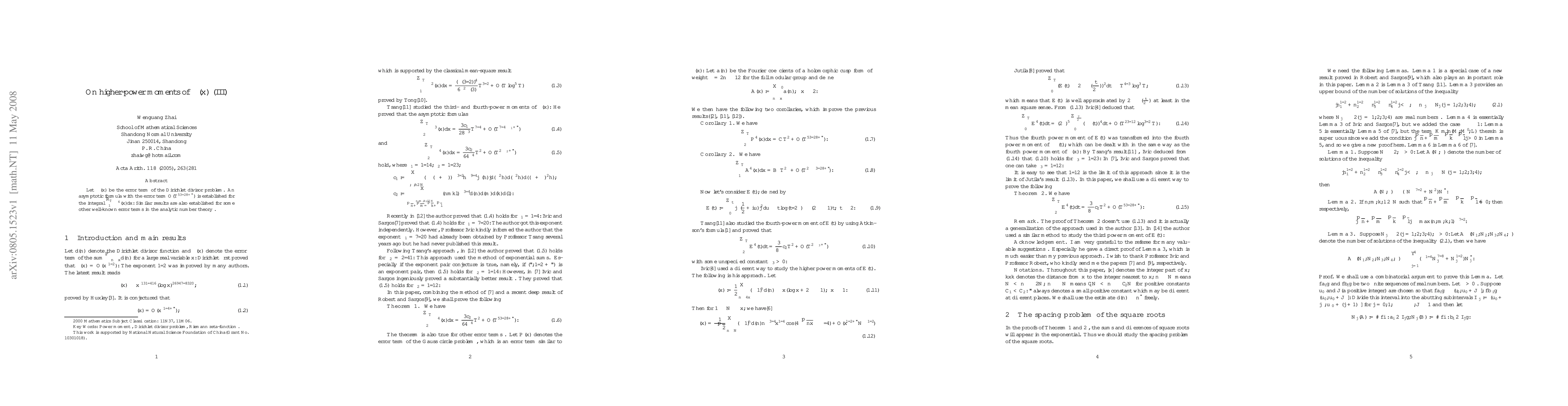 Let $\Delta(x)$ be the error term of the Dirichlet divisor problem. An asymptotic formula with the error term $O(T^{53/28+\epsilon})$ is established for the integral $\int_1^T\Delta^4(x)dx.$ Similar results are also established for some other well-known error terms in the analytic number theory .