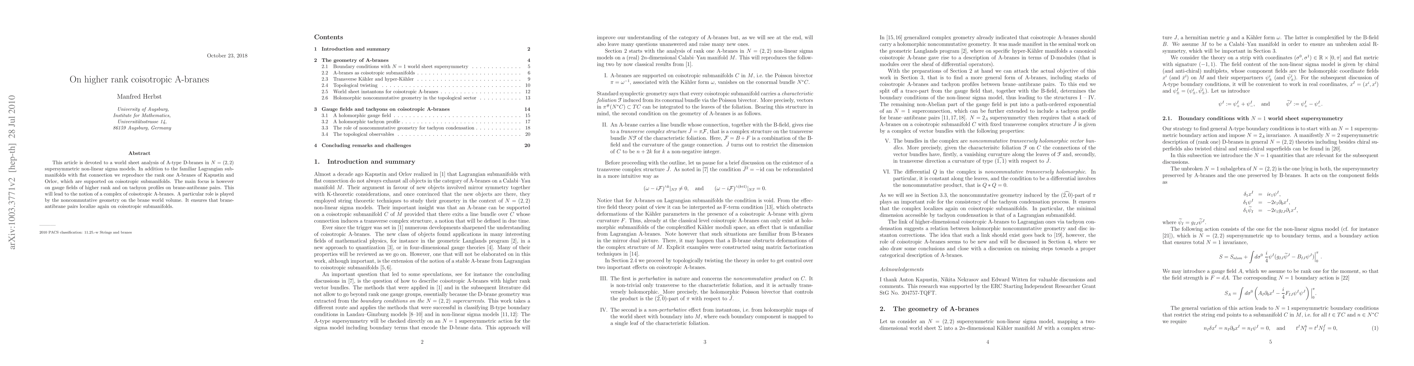 This paper analyzes A-type D-branes in N=(2,2) supersymmetric models, focusing on higher rank gauge fields and tachyon profiles. It introduces the concept of complex coisotropic A-branes and highlights the role of noncommutative geometry in localizing brane-antibrane pairs on coisotropic submanifolds.