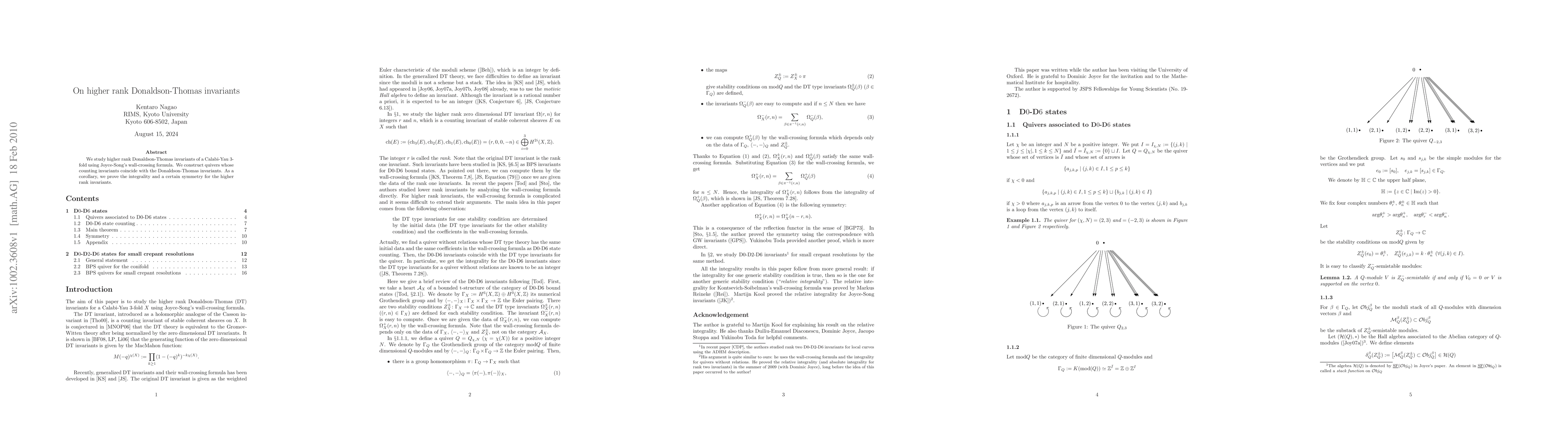 The paper explores higher rank Donaldson-Thomas invariants in Calabi-Yau 3-folds through Joyce-Song's wall-crossing formula, constructs quivers matching these invariants, and proves integrality and symmetry properties of the higher rank invariants.