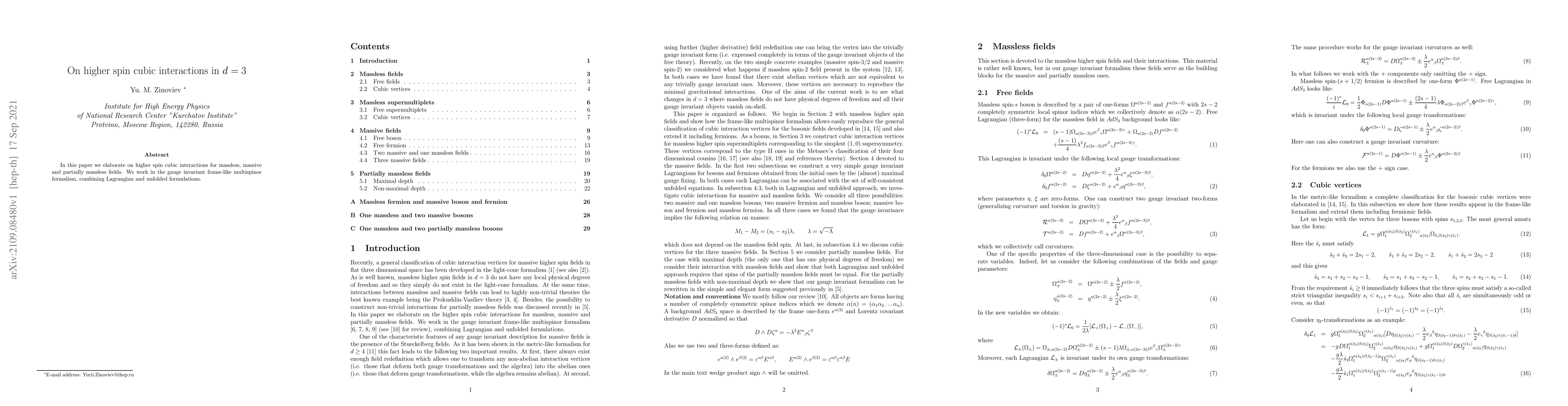 This paper explores higher spin cubic interactions in d=3 dimensions, focusing on massless, massive, and partially massless fields using a gauge invariant multispinor formalism.
