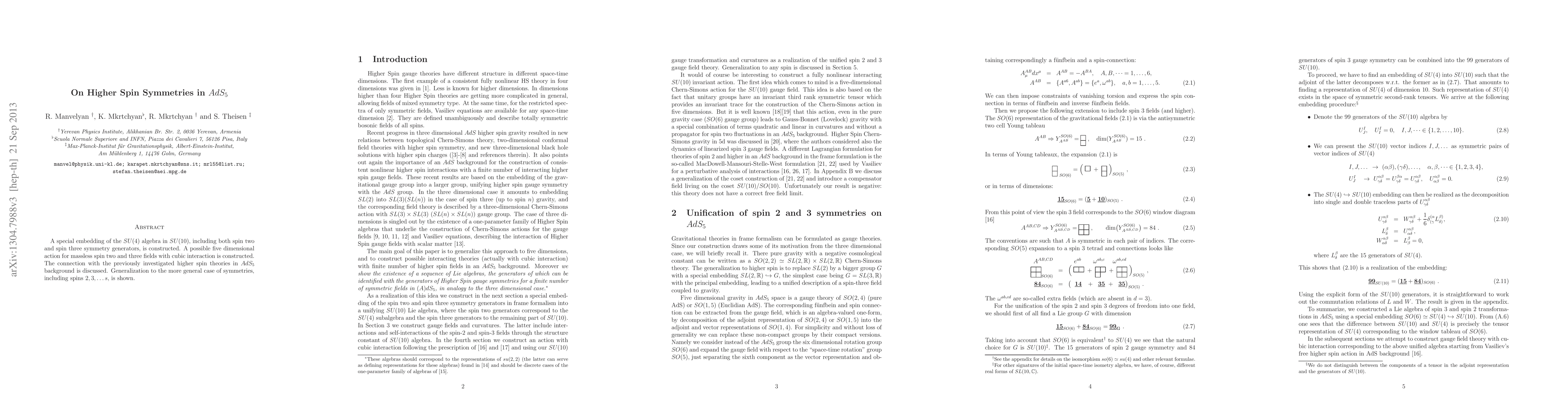 A special embedding of the SU(4) algebra in SU(10), including both spin two and spin three symmetry generators, is constructed. A possible five dimensional action for massless spin two and three fields with cubic interaction is constructed. The connection with the previously investigated higher spin theories in $AdS_{5}$ background is discussed. Generalization to the more general case of symmetries, including spins $2,3,\dots s$, is shown.