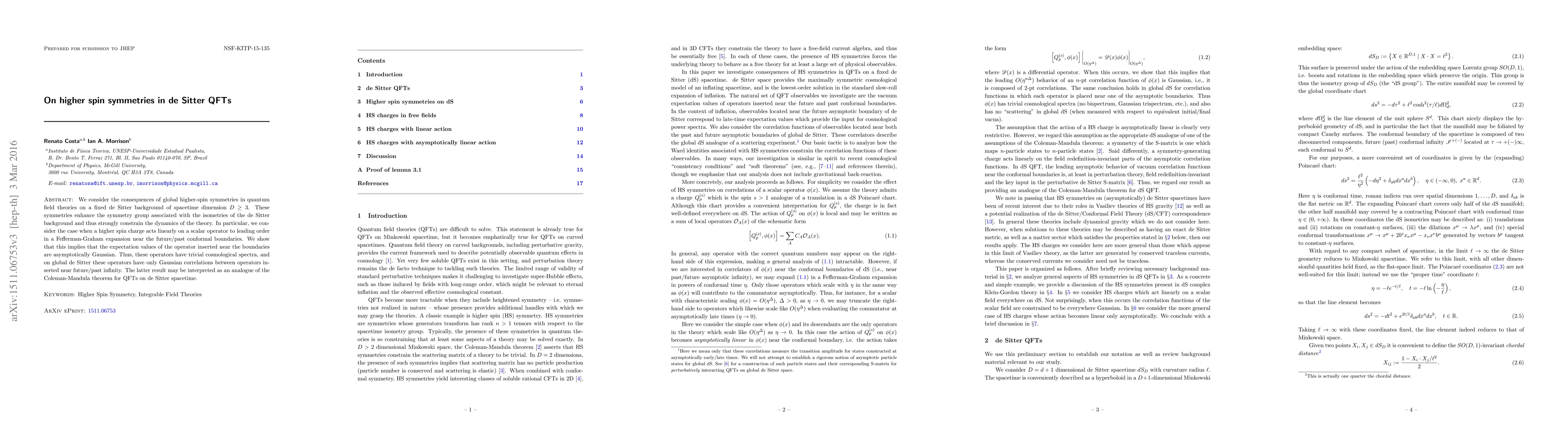 We consider the consequences of global higher-spin symmetries in quantum field theories on a fixed de Sitter background of spacetime dimension $D \ge 3$. These symmetries enhance the symmetry group associated with the isometries of the de Sitter background and thus strongly constrain the dynamics of the theory. In particular, we consider the case when a higher spin charge acts linearly on a scalar operator to leading order in a Fefferman-Graham expansion near the future/past conformal boundaries. We show that this implies that the expectation values of the operator inserted near the boundaries are asymptotically Gaussian. Thus, these operators have trivial cosmological spectra, and on global de Sitter these operators have only Gaussian correlations between operators inserted near future/past infinity. The latter result may be interpreted as an analogue of the Coleman-Mandula theorem for QFTs on de Sitter spacetime.