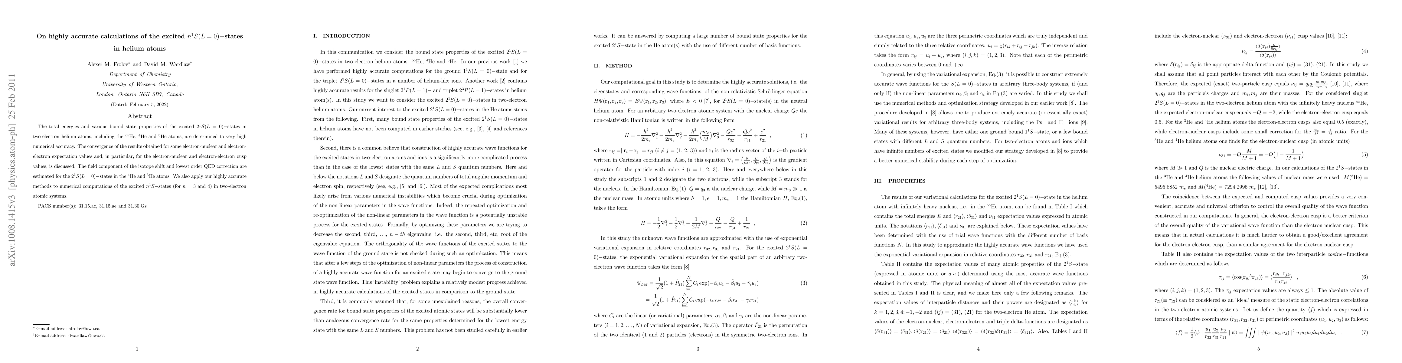This paper presents highly accurate calculations of the excited $2^1S(L = 0)$ states in helium atoms, including total energies and bound state properties for various isotopes. It also discusses convergence in electron-nuclear and electron-electron interactions, estimates isotope shifts, and applies similar methods to $n^1S$ states for $n$ = 3 and 4.