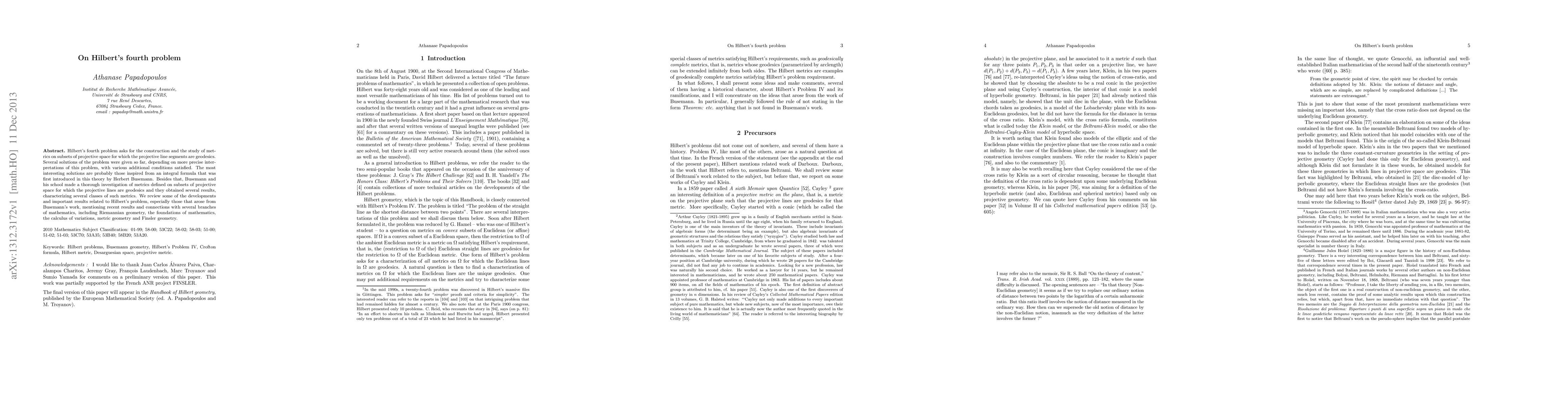Hilbert's fourth problem asks for the construction and the study of metrics on subsets of projective space for which the projective line segments are geodesics. Several solutions of the problem were given so far, depending on more precise interpretations of this problem, with various additional conditions satisfied. The most interesting solutions are probably those inspired from an integral formula that was first introduced in this theory by Herbert Busemann. Besides that, Busemann and his school made a thorough investigation of metrics defined on subsets of projective space for which the projective lines are geodesics and they obtained several results, characterizing several classes of such metrics. We review some of the developments and important results related to Hilbert's problem, especially those that arose from Busemann's work, mentioning recent results and connections with several branches of mathematics, including Riemannian geometry, the foundations of mathematics, the calculus of variations, metric geometry and Finsler geometry.