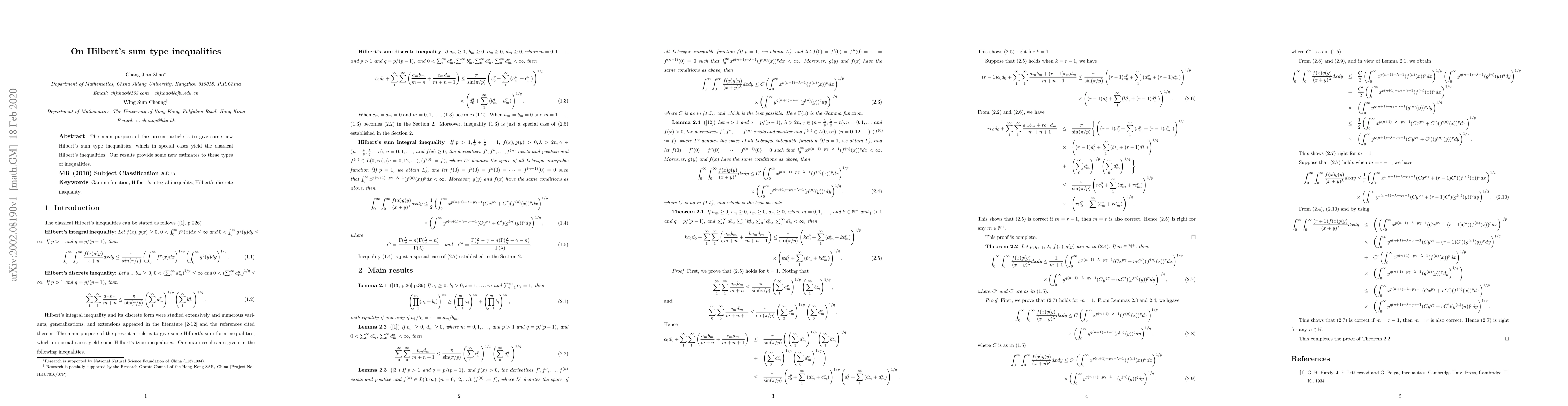 This paper introduces novel Hilbert's sum type inequalities, offering refined estimates and reducing to classical Hilbert's inequalities in specific instances.