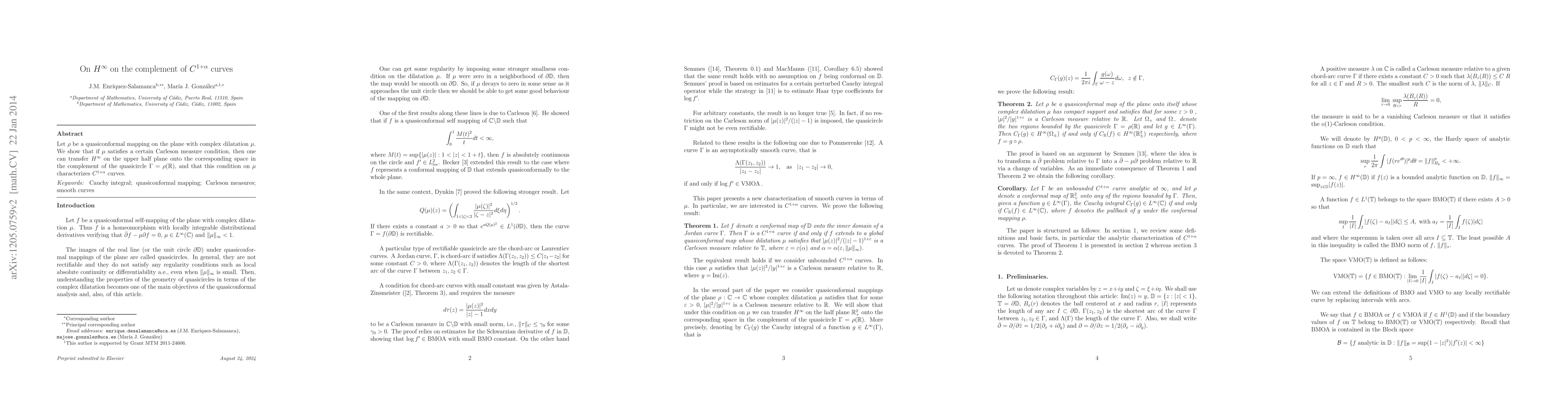 Let $\rho$ be a quasiconformal mapping on the plane with complex dilatation $\mu$. We show that if $\mu$ satisfies a certain Carleson measure condition, then one can transfer $H^{\infty}$ on the upper half plane onto the corresponding space in the complement of the quasicircle $\Gamma=\rho(\mathbb{R})$, and that this condition on $\mu$ characterizes $C^{1+\alpha}$ curves.