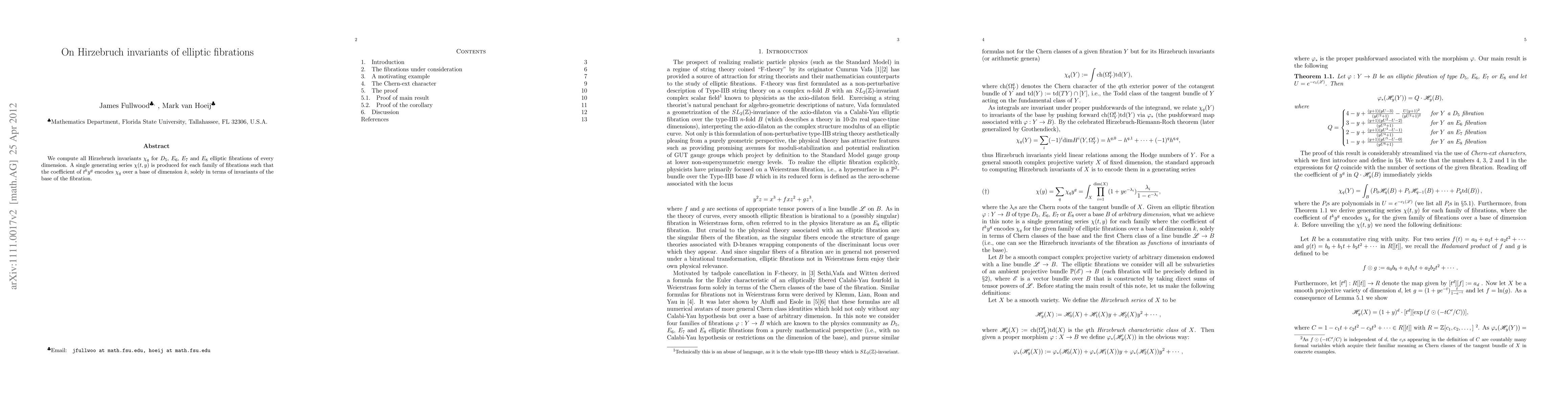 The research computes Hirzebruch invariants $\chi_q$ for $D_5$, $E_6$, $E_7$, and $E_8$ elliptic fibrations of various dimensions and presents a generating series $\chi(t,y)$ for each fibration type that encodes these invariants in terms of base invariants.