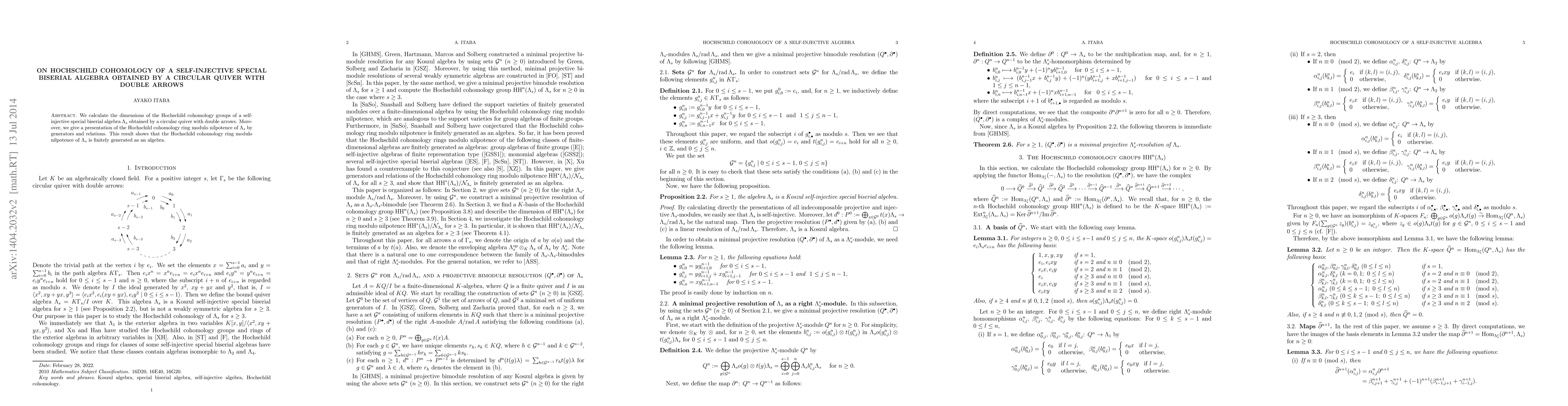 We calculate the dimensions of the Hochschild cohomology groups of a self-injective special biserial algebra $\Lambda_{s}$ obtained by a circular quiver with double arrows. Moreover, we give a presentation of the Hochschild cohomology ring modulo nilpotence of $\Lambda_{s}$ by generators and relations. This result shows that the Hochschild cohomology ring modulo nilpotence of $\Lambda_{s}$ is finitely generated as an algebra.