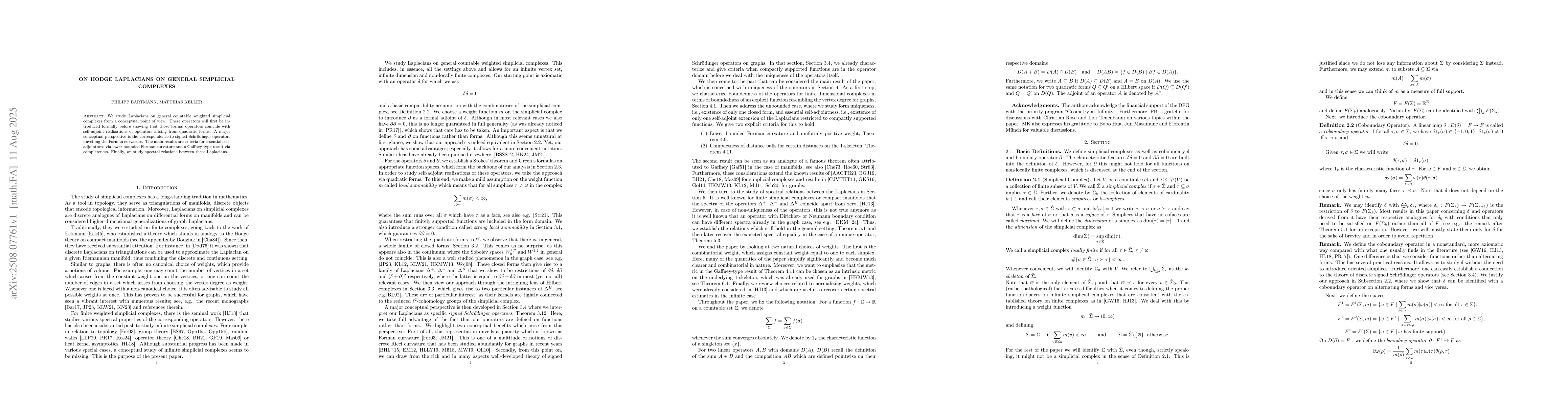 We study Laplacians on general countable weighted simplicial complexes from a conceptual point of view. These operators will first be introduced formally before showing that those formal operators coincide with self-adjoint realizations of operators arising from quadratic forms. A major conceptual perspective is the correspondence to signed Schr\"odinger operators unveiling the Forman curvature. The main results are criteria for essential self-adjointness via lower bounded Forman curvature and a Gaffney type result via completeness. Finally, we study spectral relations between these Laplacians.