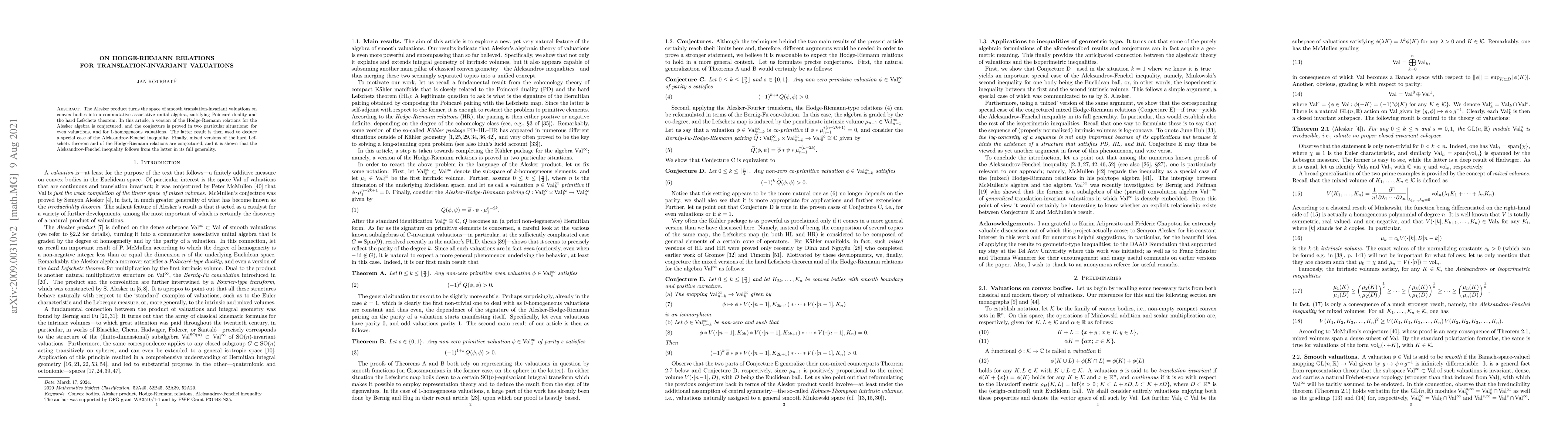 This paper explores Hodge-Riemann relations within the Alesker algebra of smooth translation-invariant valuations on convex bodies, proving the conjecture in specific cases and using these results to establish a special instance of the Aleksandrov-Fenchel inequality. Mixed versions of the hard Lefschetz theorem and Hodge-Riemann relations are also conjectured.