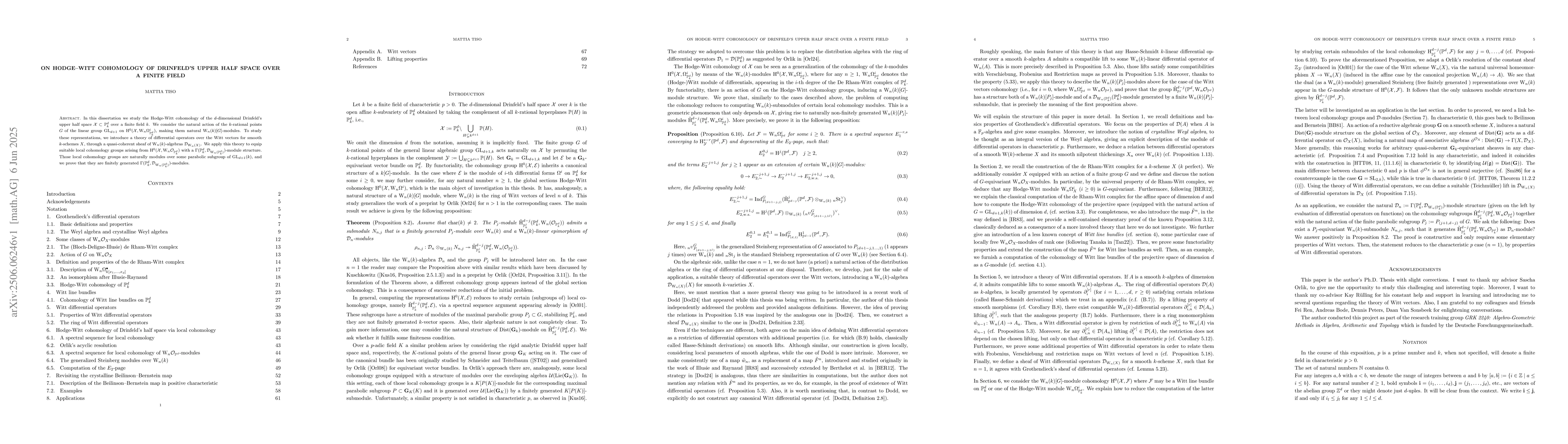 In this dissertation we study the Hodge-Witt cohomology of the $d$-dimensional Drinfeld's upper half space $\mathcal{X} \subset \mathbb{P}_k^d$ over a finite field $k$. We consider the natural action of the $k$-rational points $G$ of the linear group $\mathrm{GL}_{d+1}$ on $H^0(\mathcal{X},\mathrm{W}_n\Omega_{\mathbb{P}_k^d}^i)$, making them natural $\mathrm{W}_n(k)[G]$-modules. To study these representations, we introduce a theory of differential operators over the Witt vectors for smooth $k$-schemes $X$, through a quasi-coherent sheaf of $\mathrm{W}_n(k)$-algebras $\mathcal{D}_{\mathrm{W}_n(X)}$. We apply this theory to equip suitable local cohomology groups arising from $H^0(\mathcal{X},\mathrm{W}_n\mathcal{O}_{\mathbb{P}_k^d})$ with a $\Gamma(\mathbb{P}_k^d,\mathcal{D}_{\mathrm{W}_n(\mathbb{P}_k^d)})$-module structure. Those local cohomology groups are naturally modules over some parabolic subgroup of $\mathrm{GL}_{d+1}(k)$, and we prove that they are finitely generated $\Gamma(\mathbb{P}_k^d,\mathcal{D}_{\mathrm{W}_n(\mathbb{P}_k^d)})$-modules.