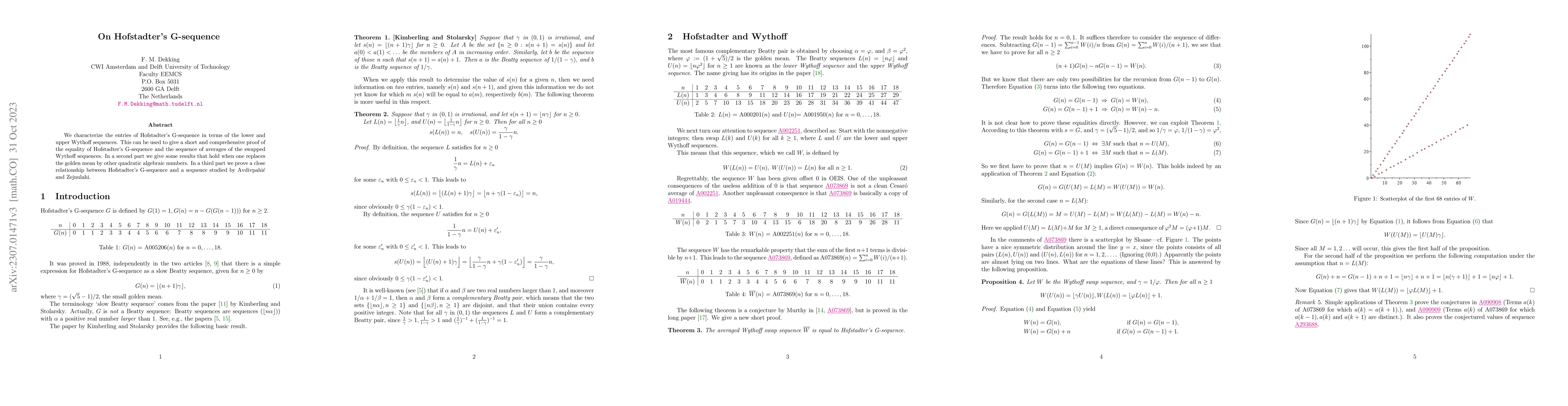 We characterize the entries of Hofstadter's G-sequence in terms of the lower and upper Wythoff sequences. This can be used to give a short and comprehensive proof of the equality of Hofstadter's G-sequence and the sequence of averages of the swapped Wythoff sequences. In a second part we give some results that hold when one replaces the golden mean by other quadratic algebraic numbers. In a third part we prove a close relationship between Hofstadter's G-sequence and a sequence studied by Avdivpahic and Zejnulahi.