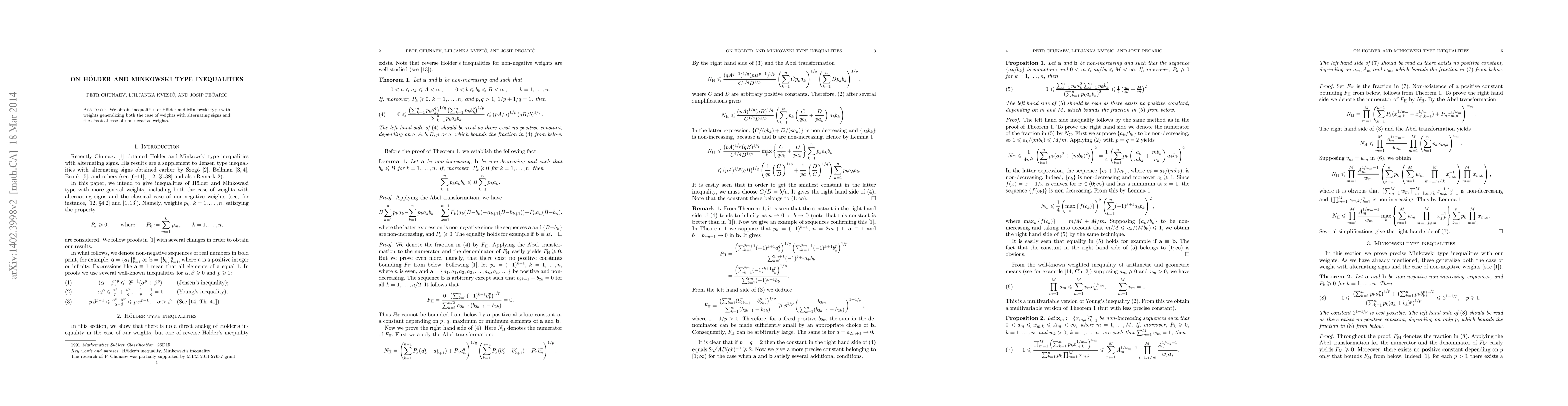 This paper establishes H"{o}lder and Minkowski type inequalities with weights, generalizing both positive and negative weight cases, providing a new understanding of these mathematical concepts.