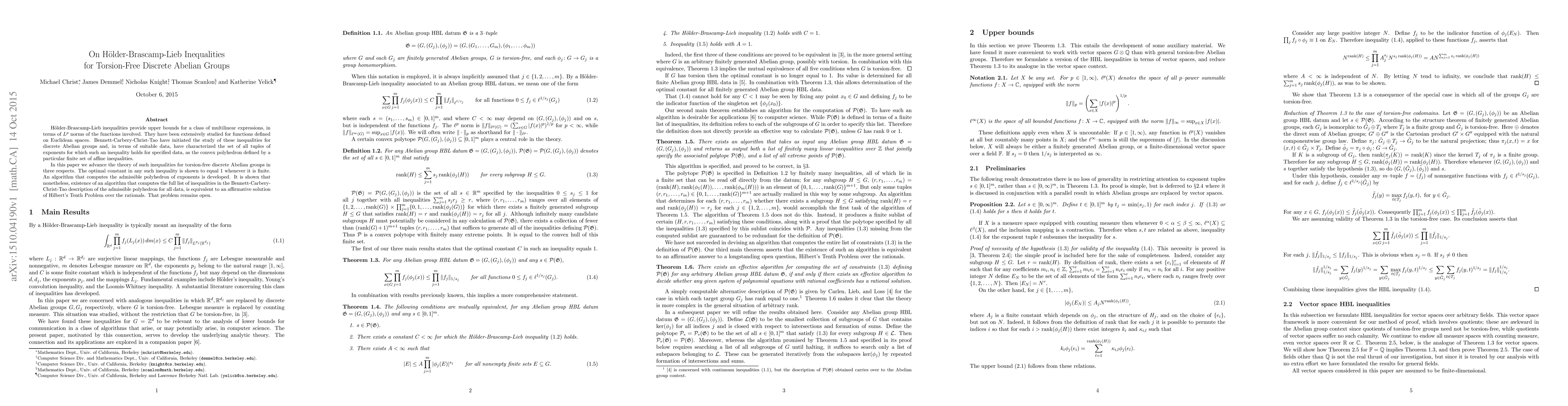 This paper advances the study of Holder-Brascamp-Lieb inequalities for torsion-free discrete Abelian groups, proving that the optimal constant is $1$ when finite, developing an algorithm for computing admissible exponent polyhedra, and showing the equivalence of computing all inequalities to solving Hilbert's Tenth Problem.