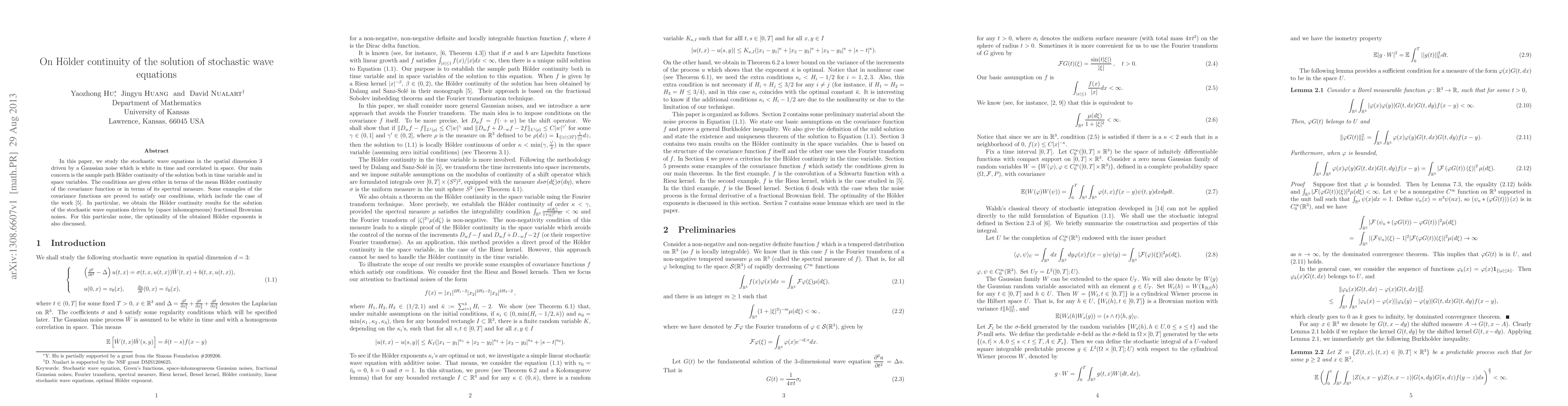 This paper investigates the sample path H\"older continuity of solutions to stochastic wave equations in three dimensions driven by Gaussian noise. It establishes conditions for such continuity in terms of the covariance function's mean H\"older continuity or spectral measure, and proves the results for specific covariance functions, including fractional Brownian noise.
