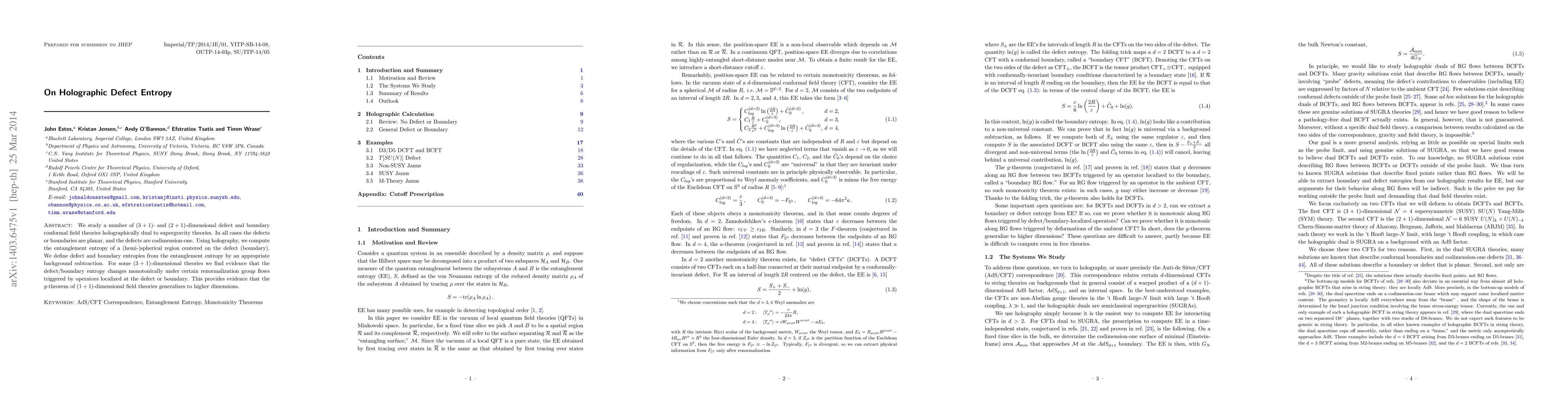 This paper explores holographic dualities in (3+1)- and (2+1)-dimensional conformal field theories with codimension-one defects and planar boundaries. It computes entanglement and defect/boundary entropies, finding monotonic changes in some (3+1)-dimensional cases that support the generalization of the g-theorem to higher dimensions.