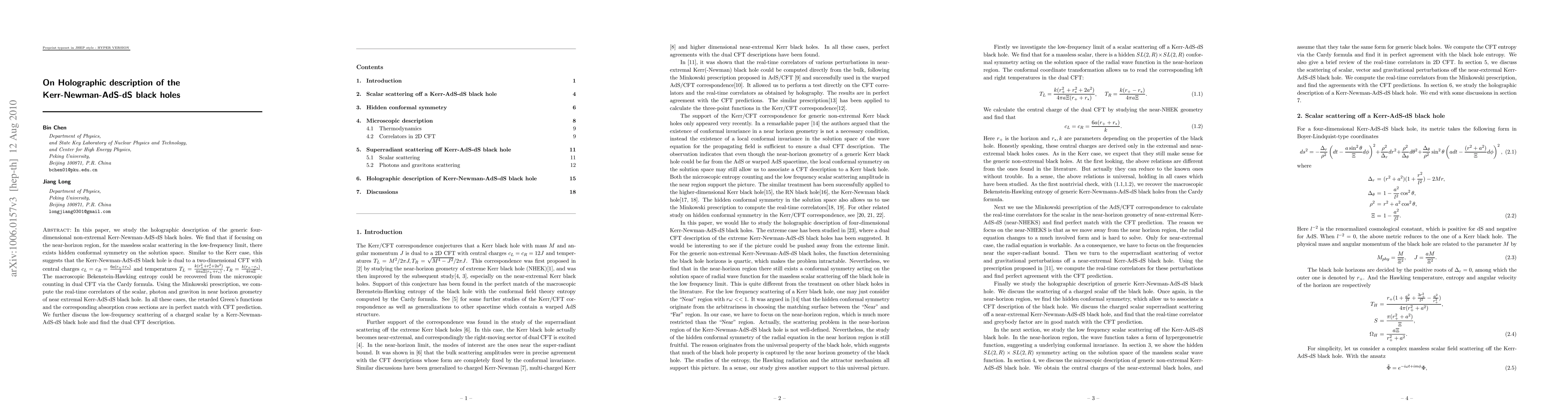 In this paper, we study the holographic description of the generic four-dimensional non-extremal Kerr-Newman-AdS-dS black holes. We find that if focusing on the near-horizon region, for the massless scalar scattering in the low-frequency limit, there exists hidden conformal symmetry on the solution space. Similar to the Kerr case, this suggests that the Kerr-Newman-AdS-dS black hole is dual to a two-dimensional CFT with central charges $c_L=c_R=\frac{6a(r_++r_\ast)}{k}$ and temperatures $T_L=\frac{k(r_+^2+r_\ast^2+2a^2)}{4\pi a\Xi(r_++r_\ast)}, T_R=\frac{k(r_+-r_\ast)}{4\pi a\Xi}$. The macroscopic Bekenstein-Hawking entropy could be recovered from the microscopic counting in dual CFT via the Cardy formula. Using the Minkowski prescription, we compute the real-time correlators of the scalar, photon and graviton in near horizon geometry of near extremal Kerr-AdS-dS black hole. In all these cases, the retarded Green's function and the corresponding absorption cross section are in perfect match with CFT prediction. We further discuss the low-frequency scattering of a charged scalar by a Kerr-Newman-AdS-dS black hole and find the dual CFT description.
