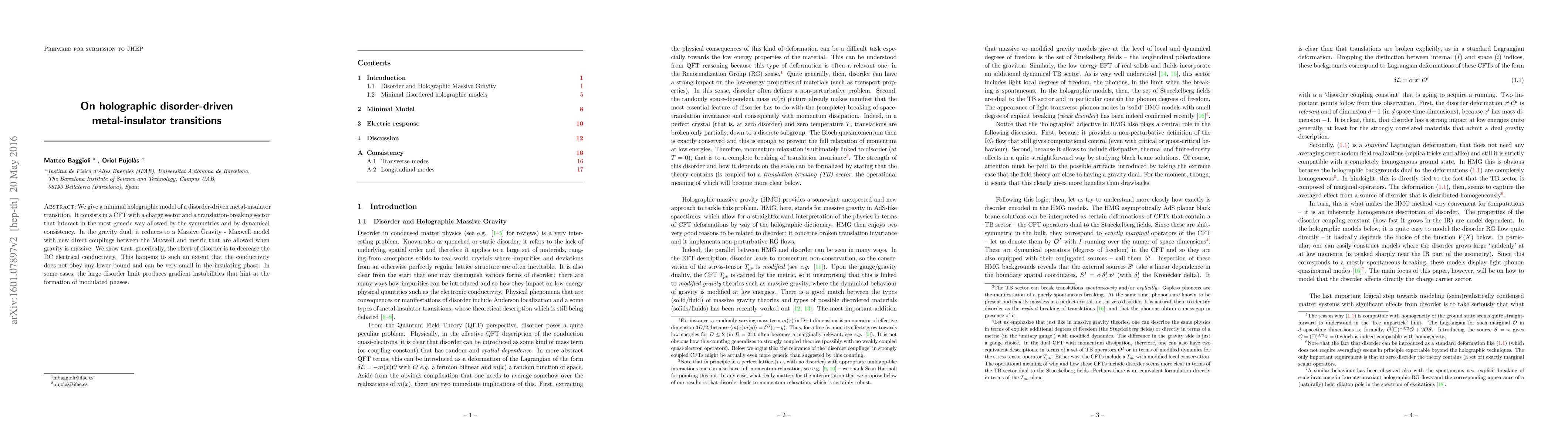 This paper presents a holographic model for disorder-driven metal-insulator transitions, showing that disorder decreases DC electrical conductivity, potentially leading to insulating phases with very low conductivity. It also identifies gradient instabilities in high disorder scenarios, suggesting the emergence of modulated phases.