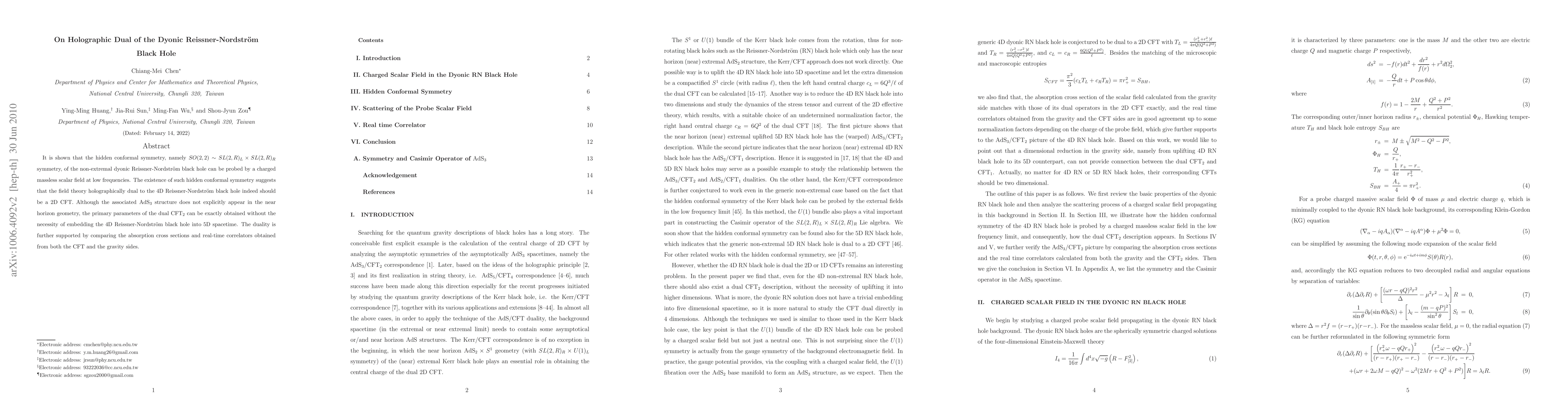 This paper demonstrates that the hidden conformal symmetry of the dyonic Reissner-Nordström black hole can be explored via a charged massless scalar field, suggesting a holographic dual 2D CFT. The study confirms this duality by comparing the absorption cross sections and real-time correlators from both the CFT and the gravity sides.